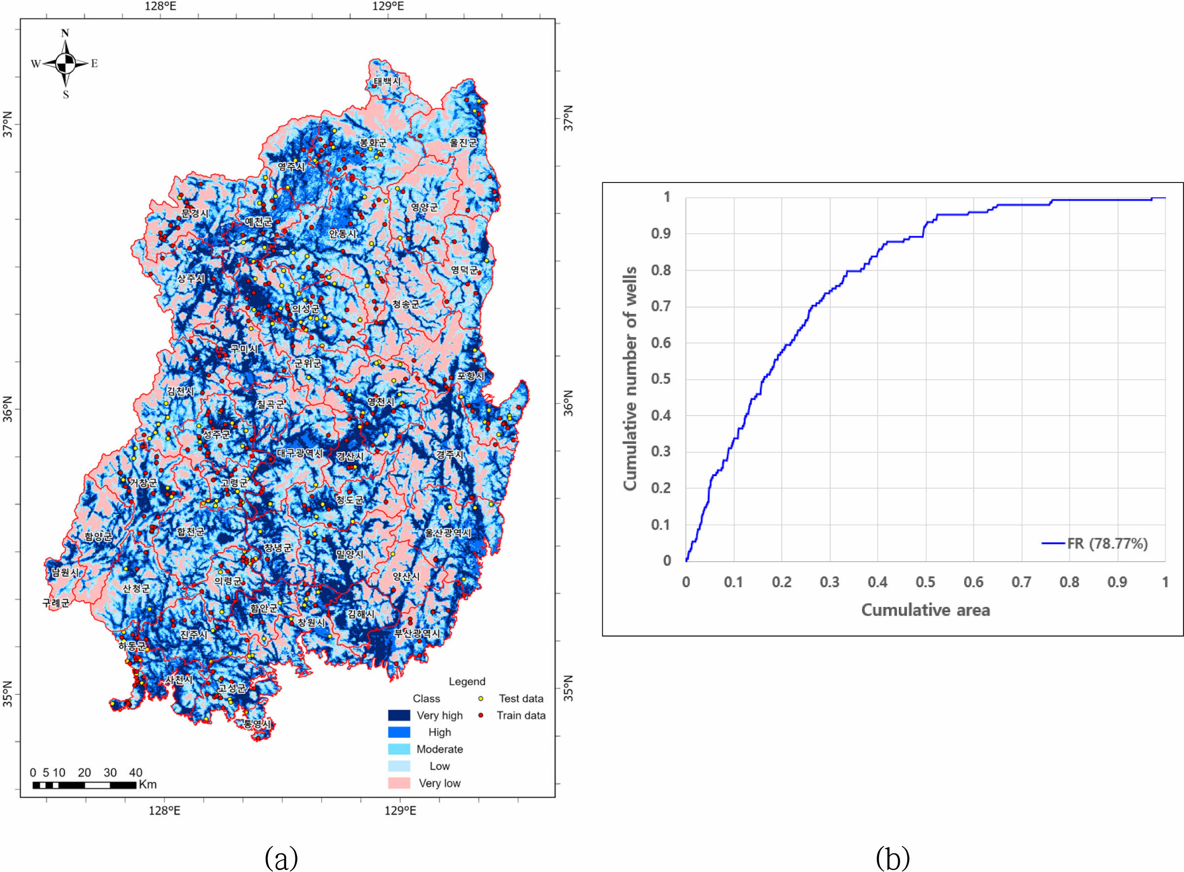 AUC는 ROC 곡선 아래 영역으로, AUC가 높다는 것은 클래스(예: 산출 등급)를 구분하는 모델의 성능이 뛰어나다는 것을 의미한다. Das (2019)은 IF, FR, AHP의 성능을 검증하기 위해 등급별 누적 면적(cumulative areas)과 누적 관정 수(cumulative number of wells)를 도시하여 AUC를 계산한 후, FR(75%)이 IF(71%)와 AHP (70%)와 비교하여 뛰어난 성능을 보이는 것을 확인하였다. 유사하게, Razandi et al.(2015)은 AHP, FR, CF를 통해 얻어진 GPM 결과에 대해 ROC 곡선을 구성하고, AUC를 계산한 후 성능을 비교하였다. FR 모델 결과(77.55%)가 AHP(73.47%) 및 CF (65.08%) 모델 결과보다 성능이 우수한 것으로 나타났다. Hasanuzzaman et al. (2022)의 경우, AUC를 이용하여, 기계학습방법(RF(85.3%)와 NB (Naïve Bayes; 85.5%))이 AHP(78.8%)와 FR(81%)와 비교하여 성능이 뛰어나다는 결론을 내렸다. 낙동강권역에서도 FR은 유사한 AUC(79%)를 보였다(Fig. 8b). 여기서 AUC는 훈련 자료로 사용되지 않은 비양수량 자료(Fig. 8a의 test data)를 이용하여 평가한 결과이다.