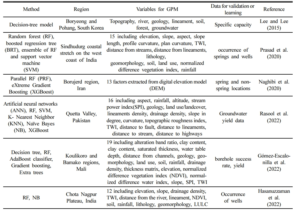 국내의 경우, 한국지질자원연구원에서 MCDM, 통계기반모델, 기계학습방법을 활용하여 지하수 산출 유망지 평가 연구를 수행한 바 있다. AHP와 TOPSIS를 이용하여 2021년과 2023년 각각 금강권역 및 낙동강권역의 GPM을 제시하였으며(KIGAM, 2021; 2032), 이외에도 통계기반모델(예: FR) 및 기계학습방법(예: SVR, Convolutional Neural Networks (CNN))을 이용하여 지하수산출가능성도를 구축하고 환경 빅데이터 플랫폼(https://www.bigdata-environment.kr/)에 공개하였다. GPM의 검증에는 기존 관정의 비양수량 또는 투수량계수가 이용되었다. 이외에도 환경부의 ‘통합 지하수 기초조사 및 지하수지도 제작 관리 지침’은 지하수 기초조사 시 지하수 개발유망지점을 평가 및 검토하도록 하고 있으나, 주제도 선정 및 개발유망지점 평가 방법 등에 관한 가이드라인은 부재한 실정이다.