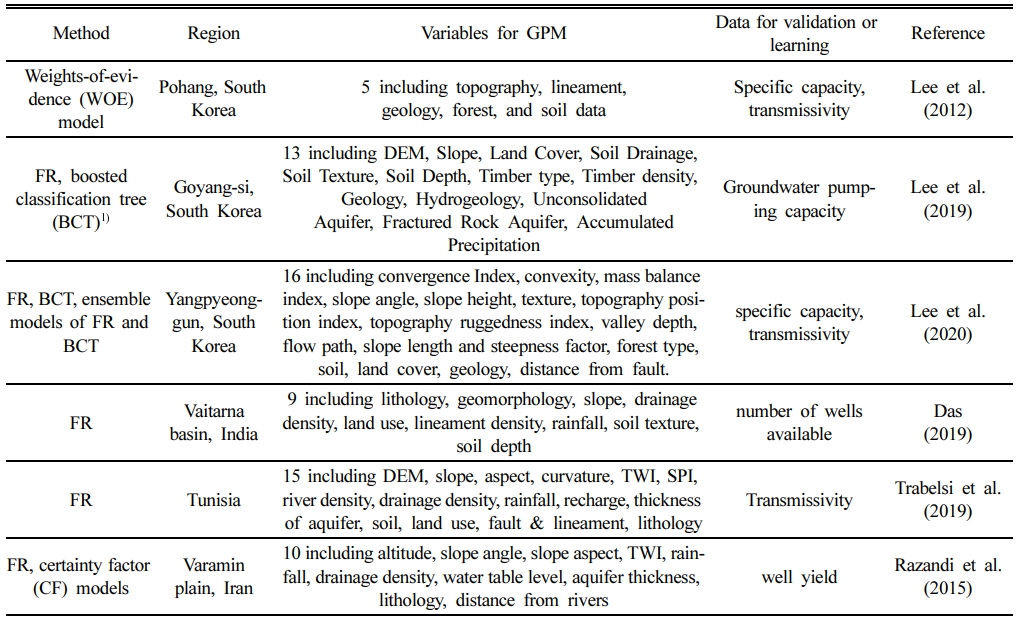 GPM은 지하수 산출성과 상관관계가 있다고 판단되는 공간 자료를 주제도(Thematic map) 형식으로 구축한 후 지리정보시스템(GIS) 기술을 이용하여 지하수 산출 가능성을 평가한 것이다. Díaz-Alcaide and Martínez-Santos (2019)는 200개 이상의 GPM 관련 연구 결과물을 검토하고 자주 사용되는 20개의 변수(variable)를 정리하였으며, 이 중 지질, 선구조, 지형, 토양, 토지이용도, 강우, 배수밀도, 경사도의 8개 변수가 GPM 평가에 가장 자주 사용되는 것을 확인하였다.