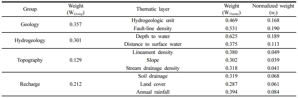 한국지질자원연구원은 10개의 주제도에 대한 쌍대 비교를 통해 가중치를 산정한 바 있다(KIGAM, 2021). 총 50명의 지하수 전문가가 설문 조사에 참여하였고, 일관성 검정 결과, 일관성지수(CR)가 10% 미만인 것으로 나타나 설문 결과에는 일관성이 있는 것으로 판단되었다. 이에 도출된 가중치(Table 4)를 GPM 평가에 이용하였다.