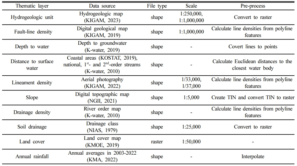 수리지질 특성의 경우, 등수심(Depth to groundwater)과 지표수까지의 거리(Distance to surface water)를 이용하여 반영하였다. 등수심도(m)는 한국수자원공사에서 구축한 지하수 등수심선 자료를 국가공간정보포털(www. nsdi.go.kr/)에서 다운받아 점(point) 정보로 변환한 후 보간하여 생성하였다. 지표수까지의 거리(km)는 통계청의 해안 위치 정보 및 국가수자원관리종합정보시스템(www. wamis.go.kr)에서 제공하는 국가 하천, 지방 1급 하천, 지방 2급 하천 정보를 이용하여 계산하였다.