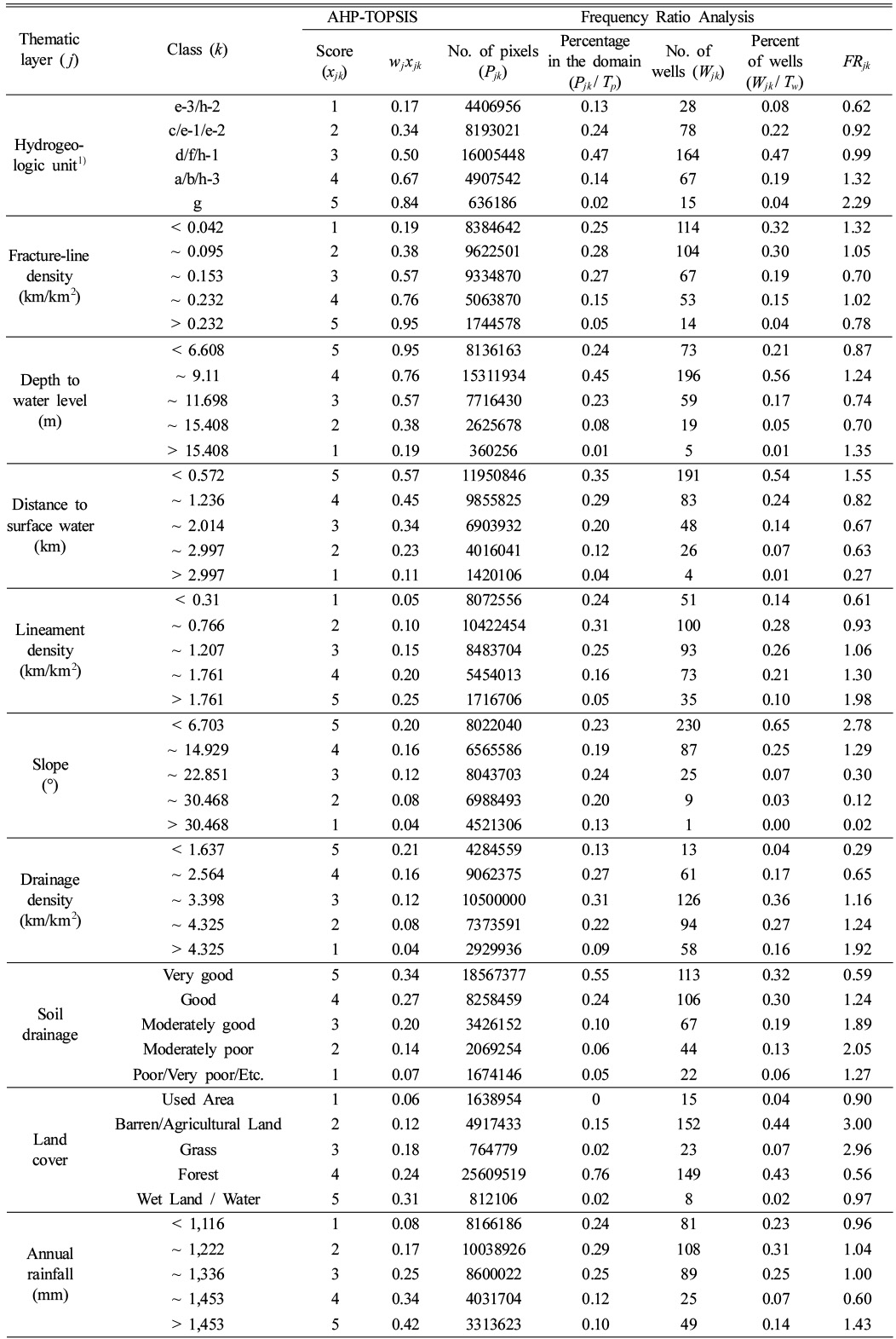 TOPSIS를 이용하여 대상(격자 i)들의 상대적 근접도를 계산하기 위해서는 주제도( j) 별로 대안값(식(1)의 xij)을 부여할 필요가 있다. 이 연구에서는 주제도의 특성에 따라 주제도를 5~12개의 등급(k)으로 나눈 후 Kumar et al. (2014)와 유사하게 1부터 5의 평가점수를 부여하였다(Table 6). 점수가 높을수록 높은 지하수 산출 가능성을 의미한다.