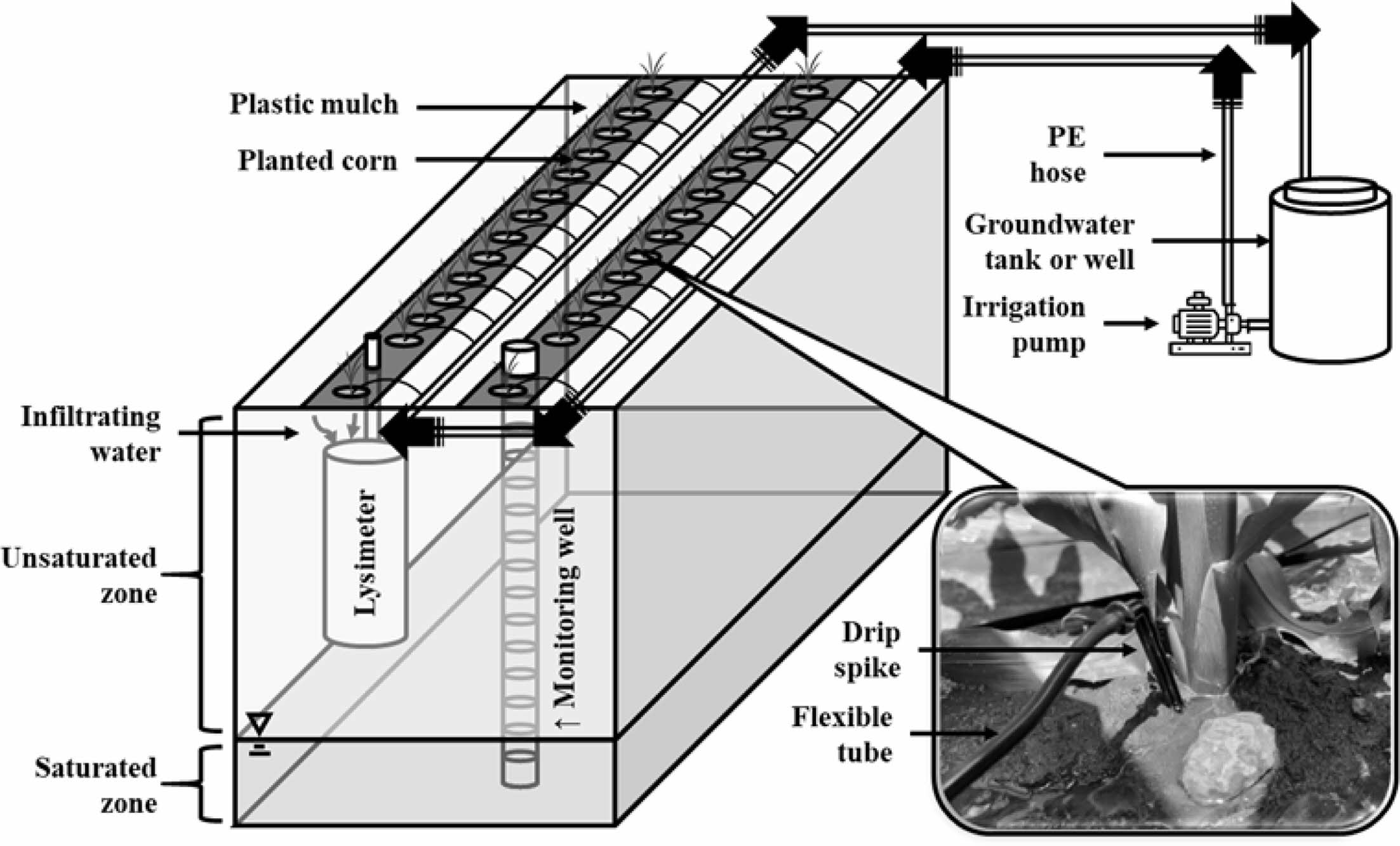 각 부지에는 2,000ℓ 부피의 관개용수 보관용 물탱크를 2~5개씩 설치하였고, 관개 시비 이전 질산성질소로 오염된 지하수를 미리 양수하여 준비하였다. 관개 시에는 농업용 양수기의 흡입구를 관개용수 보관용 물탱크에 설치하였고, 토출부를 경작지 내 설치된 PE 호스에 연결하여 질산성질소 함유 지하수를 작물에 관개할 수 있도록 하였다. 단, YS2 지역에 PAF-60%를 적용 시 양수기의 흡입구를 시험구의 지하수 상류에 위치한 관정에 연결하였다. 상기 지하수 관개 시비 장치가 설치된 시험구의 모식도는 Fig. 1과 같다.