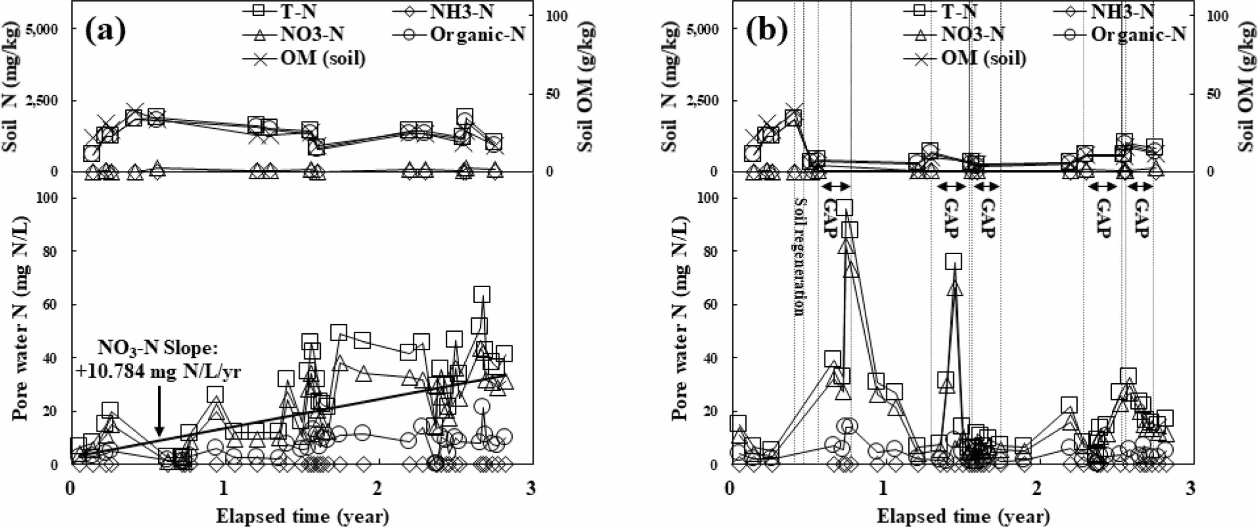 Fig. 2 Soil and pore water monitoring data of uncultivated plot #1 at YS2 site (a), and GAP applied plot #2 at YS2 site (b). Square symbol (□), diamond symbol (◇), triangle symbol (△), circle symbol (○) with solid line represent T-N, NH3-N, NO3-N, organic-N concentration in soil or pore water respectively; x symbol(X) with solid line represents organic matter(OM) concentration in soil; vertical dotted line represents cultivation period; bold solid line represents linear regression of NO3-N concentration in pore water. |