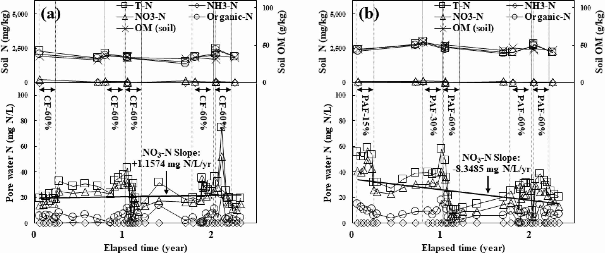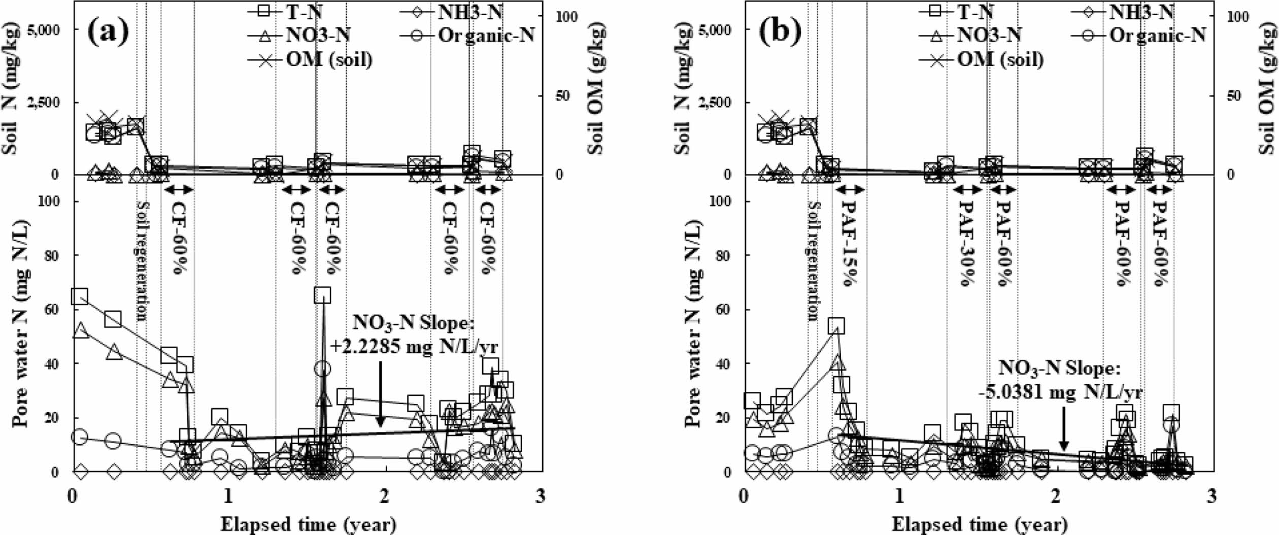 Fig. 4 Soil and pore water monitoring data of CF-60% applied plot #3 at YS2 site (a), and PAF-15, 30, and 60% applied plot #4 at YS2 site (b). Square symbol (□), diamond symbol (◇), triangle symbol (△), circle symbol (○) with solid line represent T-N, NH3-N, NO3-N, organic-N concentration in soil or pore water respectively; x symbol (X) with solid line represents organic matter (OM) concentration in soil; vertical dotted line represents cultivation period; bold solid line represents linear regression of NO3-N concentration in pore water. |