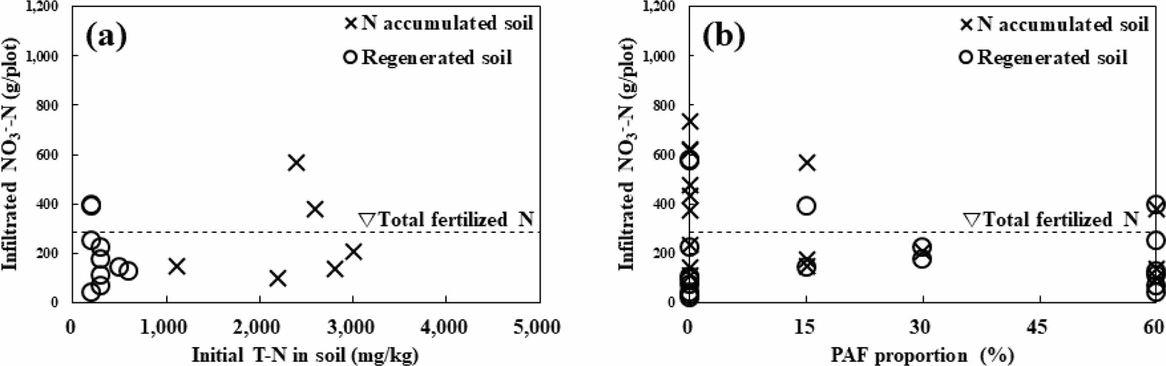 Fig. 5 Infiltrated nitrate mass during the cultivation period by initial T-N in soil (a), and infiltrated nitrate mass during the cultivation period by PAF proportion (b). X symbol (X) represents infiltrated NO3-N mass in plot during single cultivation period under N accumulated soil condition; circle symbol (○) represents infiltrated NO3-N mass in plot during single cultivation period under regenerated soil condition; horizontal dotted line represents total fertilized and/or irrigated N in plot during single cultivation period. |