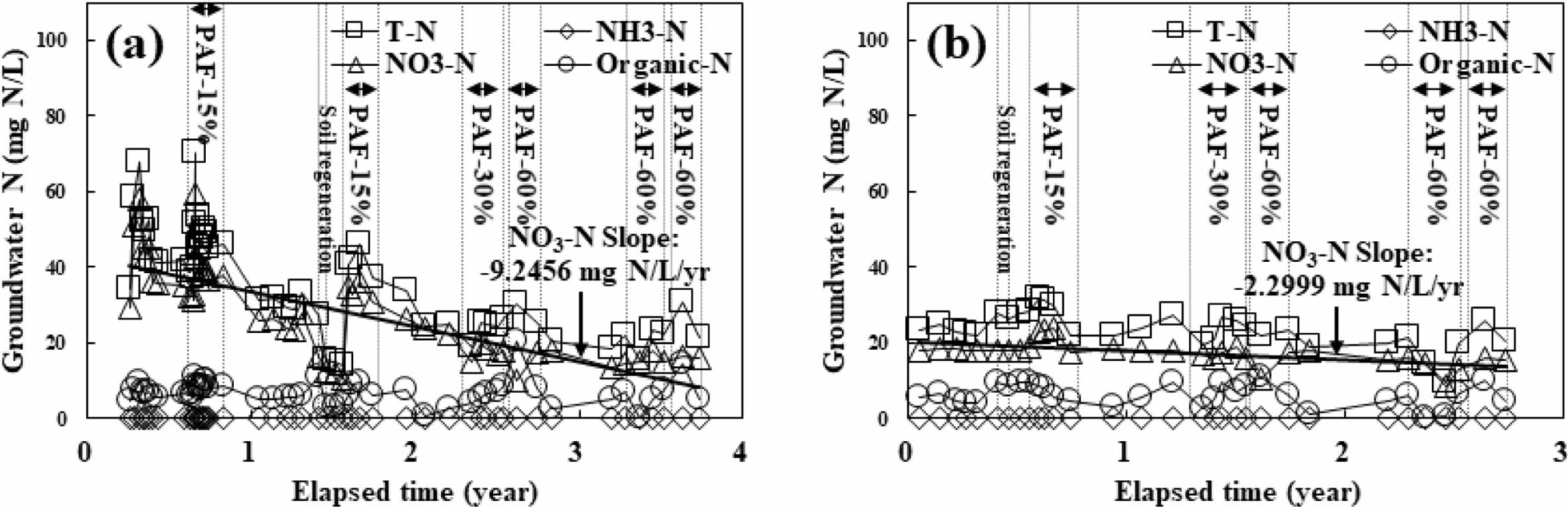 Fig. 6 Groundwater monitoring data of PAF-15, 30, and 60% applied plot #2 at YS1 site (a), and PAF-15, 30, and 60% applied plot #4 at YS2 site (b). Square symbol (□), diamond symbol (◇), triangle symbol (△), circle symbol (○) with solid line represent T-N, NH3-N, NO3-N, organic-N concentration in groundwater respectively; vertical dotted line represents cultivation period; bold solid line represents linear regression of NO3-N concentration in groundwater. |
