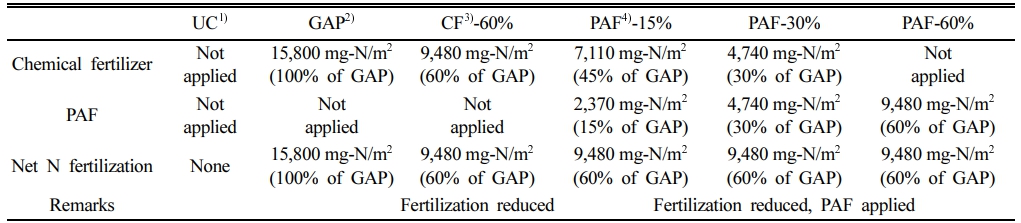본 연구에서는 관개 시비 적용에 따른 지하수로 침투하는 질산성질소의 부하 저감 평가를 위해 Uncultivated (UC), Good Agricultural Practice(GAP), Chemical Fertili- zer(CF)-60%, Pump and Fertilize(PAF)-0~60% 시비를 준비하였다(Table 1). UC는 옥수수를 파종 또는 이식하지 않고, 화학비료 시비 또는 지하수 관개를 일절 하지 않는다. GAP는 옥수수 표준시비량(15,800 mg-N/m2)을 화학비료로 시비(RDA, 2010a), CF-60%는 GAP 시비량의 60%를 화학비료로 시비한다. PAF-15%는 GAP 기준의 45%를 화학비료로 시비(7,110 mg-N/m2), GAP 기준의 15%를 관개 시비(2,370 mg-N/m2), PAF-30%는 GAP 기준의 30%를 화학비료로 시비(4,740 mg-N/m2), GAP 기준의 30%를 관개 시비(4,740 mg-N/m2), PAF-60%는 화학비료 없이 GAP 기준의 60%를 관개 시비(9,480 mg-N/m2)한다.