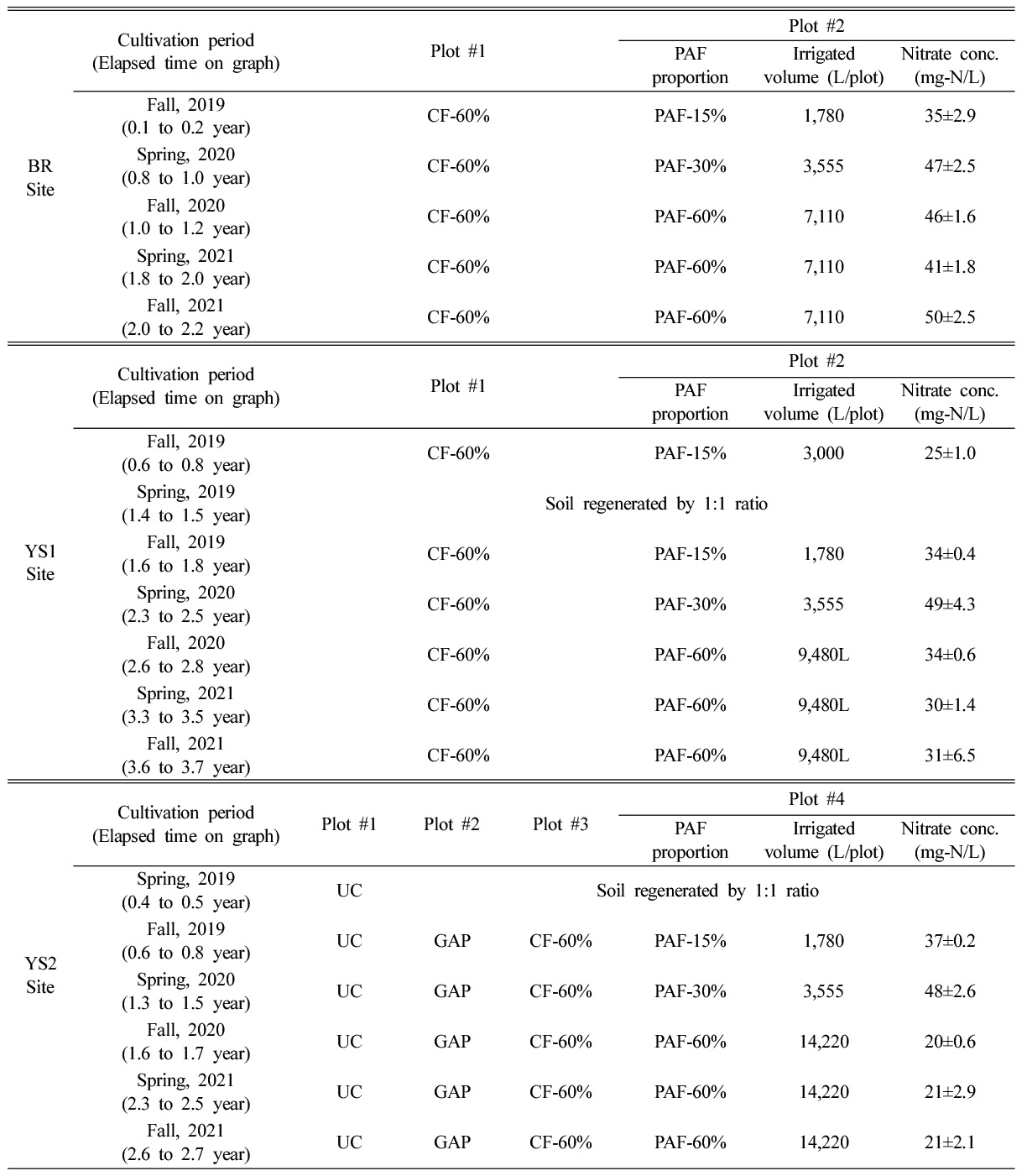 BR, YS1 지역에서는 CF-60% 및 PAF-15~60%를 각각 5~6회 반복 적용하였다(Table 2). YS2 지역의 시험구 #1~4에서는 UC, GAP, CF-60%, PAF-15~60%를 각각 5회씩 반복 적용하였다. 또한 YS1 지역 시험구 #1, 2, YS2 지역 시험구 #2~4에서는 토양 내 축적된 잉여 질소의 영향을 배제하기 위해, 기존 토양을 30 cm 걷어 낸 후, 마사토를 30 cm 객토하고 60 cm 심도까지 혼합하는 토양개량을 실시하였다.