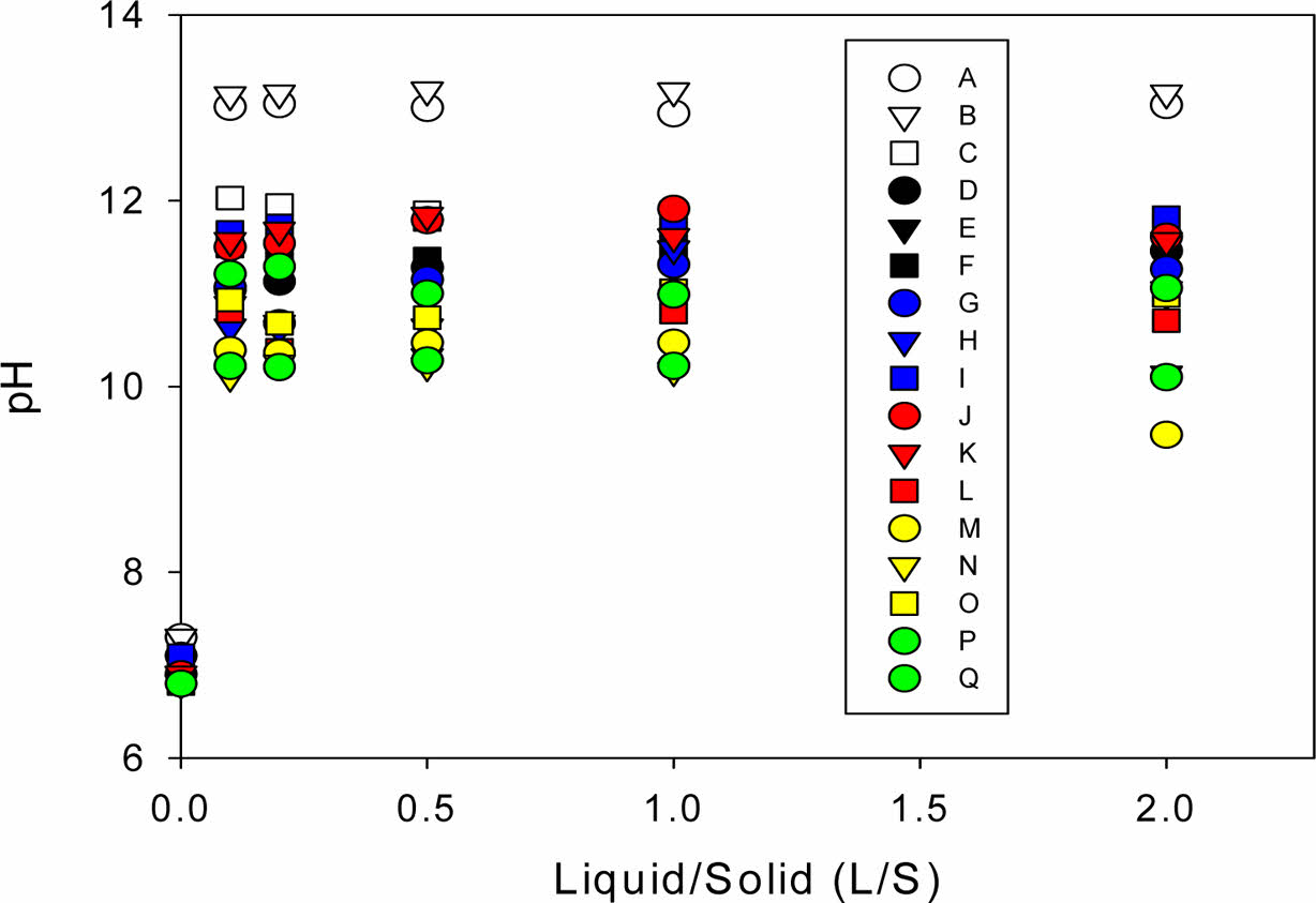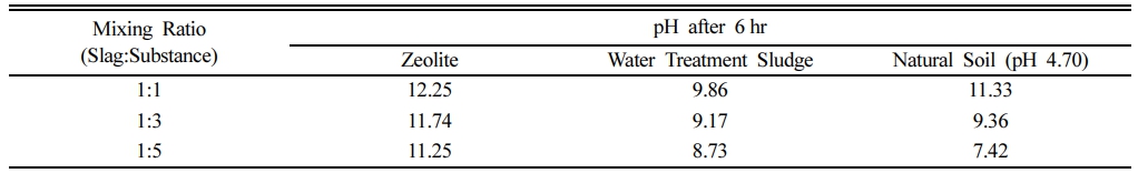 이러한 문제를 고려하여 메릴랜드를 포함한 미국의 고속도로 기관에서는 정수슬러지와 점토층을 채움재로 배치하여 유출수가 채움재를 통과하도록 관리 방안을 제시하고 있다(SHA, 2015). 본 연구에서 제강슬래그와 정수슬러지, 제올라이트, 산성토양(pH 4.70)을 각각 1:1 / 1:3 / 1:5(W/W) 비율로 혼합하여 200 rpm, 6 시간동안 진탕시험한 결과, 정수슬러지 및 산성토양에서 pH 저감 가능성을 확인하였다(Table 8). 고 pH 특성만으로 슬래그 유출수가 위해하다고 평가할 수 없으나, 주변 환경으로의 영향을 최소화하기 위한 슬래그 유출수의 pH 저감방안은 필요하다고 판단된다.
