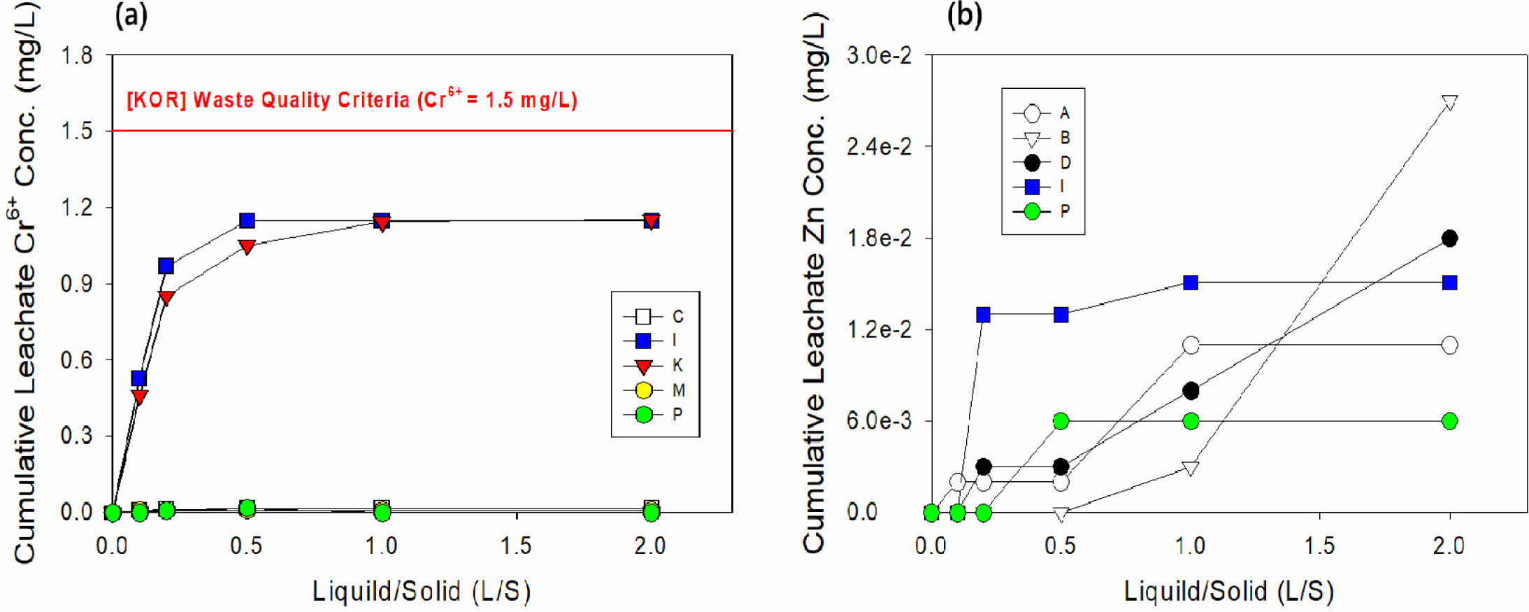 국내 상향류 투수방식 유출시험을 적용하여 시간에 따른 제강슬래그 유출수의 pH는 9.48-13.19로 높게 나타났다(Fig. 3). 또한, 중금속별 시간에 따른 용출 정도는 다르게 나타났으며, 일부 시료에서 유출수의 누적 Cr6+, Zn의 농도가 증가하였다(Fig. 4). 제강슬래그를 매체접촉형으로 재활용함에 따라 용출이 지속되는 경우 중금속 및 고 pH 유출수가 주변 환경에 영향을 미칠 가능성이 있으며, 이를 방지하기 위한 공통되고 합리적인 재활용 방안이 마련되어야 한다.