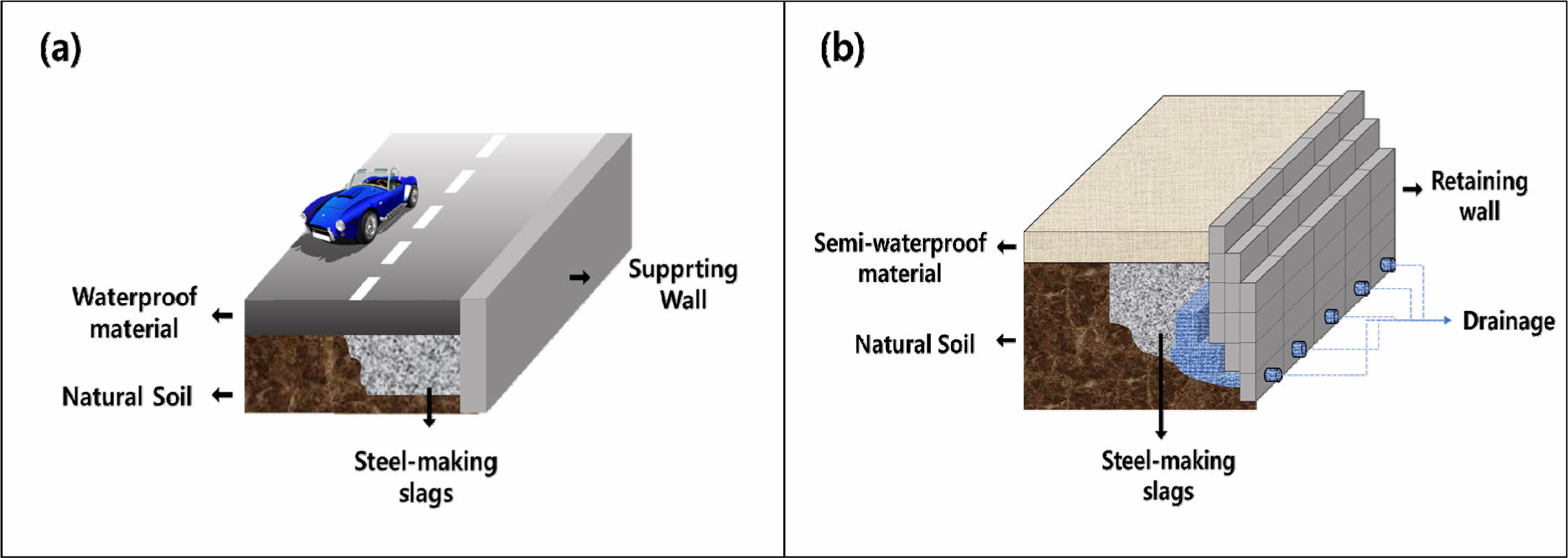 철강산업이 성장함에 따라 국제사회의 철강생산량은 꾸준히 증가하고 있으며, 2022년 세계 철강생산량은 1,885백만톤에 달하는 것으로 나타났다(WSA, 2023). 그에 따라 철강산업의 주요 부산물인 슬래그의 양도 증가하고 있으며, 국내에서는 2022년 2,450만 톤의 철강슬래그가 발생하였고 그중 고로슬래그(Blast Furnace Slag)는 1,460만톤, 제강슬래그(Steel-making slag)는 990만톤으로 나타났다(KISA, 2023). 국내에서 철강슬래그는 95% 수준의 재활용 목표율이 부여된 중요 지정부산물로 고려되고 있으며, 폐기물관리법 시행규칙에 따른 용출시험 기준을 만족하는 경우 재활용이 가능하다(KMOE, 2023a). 국내에서 발생하고 있는 철강슬래그는 제철원료, 시멘트 원료, 성토용 등 다양하게 재활용되고 있으며, 그중 제강슬래그는 대부분 도로용, 성∙복토용 골재와 같이 토양, 하천 등의 환경매체와 접촉하는 매체접촉형 유형으로 재활용되고 있다(Fig. 1).
