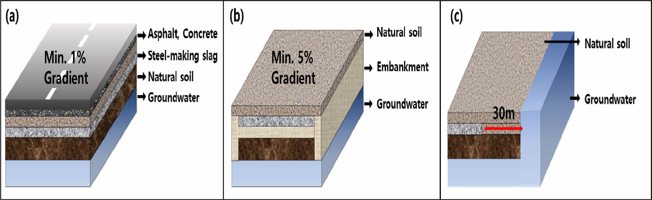 프랑스의 경우 건설폐기물 및 철강슬래그를 이용하여 재활용 순환골재를 생산하고 있으며, 도로 기층재 등으로 활용 시 물과의 접촉을 차단하기 위한 유형별 조건을 충족하여야 한다(CINDERELA, 2021). 상부가 아스팔트 등으로 포장된 경우, 최소 1%의 표면 기울기를 만족하여야 불투수층으로 간주한다. 제방 설치 등 물과의 접촉을 차단하였을 경우 최소 5%의 표면 기울기를 만족하여야 하며, 상부의 30 cm 정도는 표토로 덮여야 한다. 물과의 접촉이 차단되어 있지 않은 경우, 인근 지표 수(호수, 연못 포함)로부터 최소 30 m 이내 지역, 주변 수위보다 고도가 20 m 이상 낮은 경우에는 최소 60 m 이내 지역에서는 재활용 골재를 사용할 수 없다(Fig. 6). 프랑스에서는 스페인과 같이 슬래그의 특성을 반영한 재활용이 이루어지고 있음을 알 수 있다.