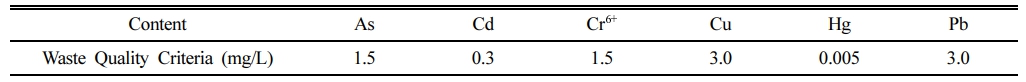 제강슬래그는 광재류로 구분되며, 폐기물 용출기준(Table 1)을 만족하는 경우 R-7(매체접촉) 유형과 R-4-2(골재 제조) 유형으로 재활용 가능하다(KMOE, 2023a). 먼저, R-7 유형의 경우 중금속 용출기준뿐만 아니라 재활용 부지 주변 환경에 대한 사후관리를 수행하여야 한다. 사후관리는 크게 ‘사후관리 준비단계’, ‘사후관리 단계’로 구분된다. ‘사후관리 준비단계’는 매체접촉형 재활용을 계획한 폐기물과 재활용 부지 인근 토양, 지하수 등에 대하여 배경농도 조사를 수행해야 한다. ‘사후관리 단계’는 1단계 기본조사와 2단계 정밀조사로 구분되며, 1단계 기본조사에서는 재활용 부지 인근 지하수를 기본 분석 대상으로 규정하고 있다. 지하수를 분석할 수 없는 경우, 재활용 부지 500 m 이내 하천∙호소수 또는 해수를 대체하여 분석할 수 있다. 분기별 1회 수행하며, 수질 매체의 오염확인 시 2단계 정밀조사로 재활용 부지 인근 토양에 대한 정밀조사를 추가로 수행하여야 한다(KMOE, 2020a).