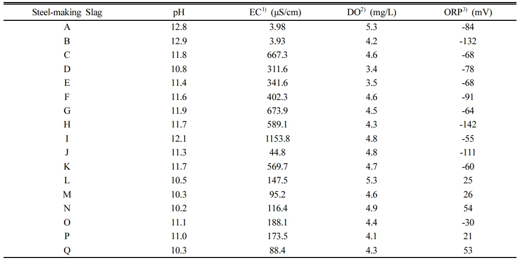 제강슬래그 용출시료 및 유출액의 pH, 전기전도도(Electrical Conductivity, EC), 용존산소(Dissolved Oxygen, DO), 산화환원전위(Oxidation-Reduction Potential, ORP)를 즉시 측정하고, 0.45 μm Cellulose nitrate Membrane filter(Whatman)로 여과한 다음 중금속 분석용 시료로 사용하였다. ICP-OES(Agilent, 5800DV)를 사용하여 모든 용출시료의 중금속 농도를 측정하였으며, 비소와 수은은 VGA 77(Agilent, Vapor Generation Accessory 77)를 ICP-OES 장비와 연결하여 측정하였다. 6가크롬은 10% sulfuric acid(H2SO4, Duksan) 3 mL를 30 mL 용출시료에 넣고 온도가 약 15oC로 떨어질 때까지 기다린 다음, 다이페닐카바자이드 용액(C13H14N4O, Duksan) 용액(1%) 1 mL를 넣고 초순수로 50 mL를 맞춘 시료를 UV-Vis Spectrophotometer(Thermo ScientificTM OrionTM Aqua- mate 8000, USA)로 540 nm에서 흡광도를 측정하였다.