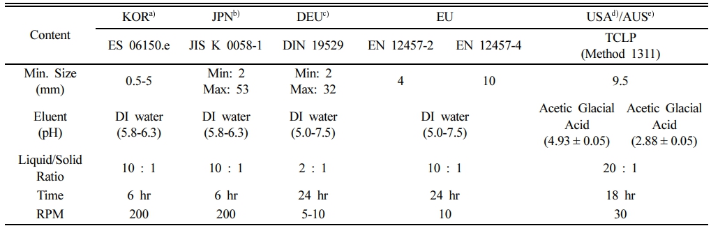 국내외 제강슬래그의 용출 특성은 회분식으로 평가되고 있으며, 일본과 독일의 경우 시료의 입자크기별로 나누어 적용하고 있다. 일본은 시료를 2 mm 이하로 파쇄하였을 경우 진탕 시험을 적용하고 있다(JIS, 2005). 국가별 회분식 용출시험 조건은 Table 3과 같다.