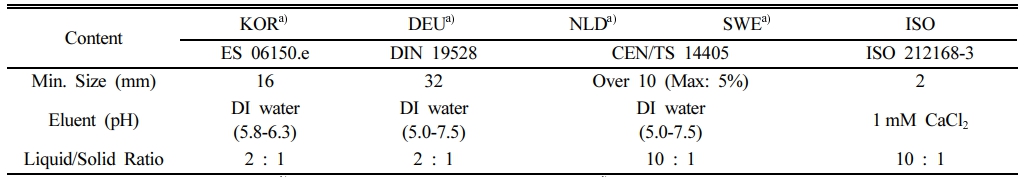상향류 투수방식의 유출시험은 중금속 등 무기물의 침출 특성을 통해 매체로의 영향을 평가하기 위해 적용되는 시험방법으로 국내에서 폐기물의 재활용환경성평가 시 적용되고 있으며, 주변 환경으로의 영향 예측 및 생태독성 평가 시료에 활용되고 있다(KMOE, 2019). 국내 폐기물공정시험기준 ES 06151.1의 경우 독일의 DIN 19528에 준하며, L/S비, 포화 및 유출속도 등 시험에 적용되는 조건이 동일하다(NIER, 2017; DIN, 2015). 국가별 상향류 투수방식 유출시험 조건은 Table 4와 같다.
