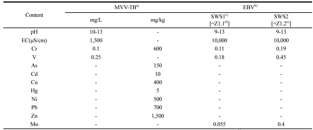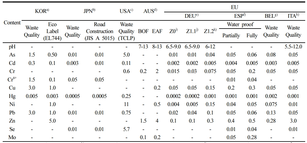 제강슬래그와 같은 광물성 폐기물을 재활용하는 경우 지하수에 미치는 영향에 따라 유형을 구분하고 있으며, 유형에 따라 폐기물 용출기준을 만족해야 재활용이 가능하다(Table 5). 슬래그로부터 발생한 고 pH수가 유출되어 지하수에 미치는 영향이 적은 경우 유출수의 pH는 최대 12까지 허용하고 있으며, 이는 슬래그의 고 pH 특성을 반영한 것으로 해석된다. 광물성 폐기물 기준을 만족한다면, 더 이상 폐기물 관리법의 영향을 받지 않으며 제품으로서 기준을 만족해야 한다(JRC, 2009; JRC, 2014). 매체접촉형 유형의 슬래그 제품에 대한 환경기준은 독일 건축 기술 연구소에서 발행한 ‘기술 건축 규정(MVV-TB)’과 독일 연방 조례에 따른 ‘건축용 재활용 골재(EBV)’를 참고하였다(Table 6)(BFJ, 2022; DIBt, 2022). 광물성 폐기물 기준을 만족한 슬래그 제품을 활용할 경우, 공통적으로 pH, 전기전도도(EC), 중금속으로는 크롬(Cr), 바나듐(V)을 규제항목으로 두고 있으며, 건축용 재활용 골재 규제에서는 몰리브덴(Mo)을 추가 규제항목으로 제시하고 있다. pH의 경우 폐기물과 제품에서 9-13의 범위로 설정되어 있으며, 이는 불순물 제거를 위한 생석회 첨가 등 생성 과정에서 발생하는 슬래그의 고유 특성을 반영한 것으로 볼 수 있다.