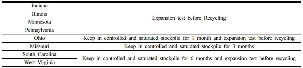 미국에서는 철강슬래그의 팽창률이 3.5%를 초과하는 경우 제방재료로 사용될 수 없다(SHA, 2015). 슬래그 팽창 우려에 따라 잔류팽창률에 대한 지침은 주마다 다르게 관리되고 있다(Table 7)(WSDOT, 2015). 하지만, 잔류팽창률을 만족하더라도 제방을 통해 스며드는 강수는 제강슬래그로부터 오염 물질을 침출하고 하천과 강을 포함한 지표수를 오염시킬 수 있으며, 발생한 유출수의 pH는 단기적으로 회복될 수 없다(Bäverman, 1997). 또한, 구조적으로 안정된 제강슬래그의 pH를 저감시키기 위해 산성조건을 적용할 경우, 슬래그 구조의 변화로 중금속 용출 등의 문제가 발생할 수 있다(Król and Bozym, 2020).