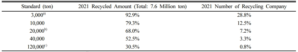 R-7 유형 중 재활용하고자 하는 폐기물의 양이 12 만톤 이상 또는 재활용 대상 부지 면적이 3만 제곱미터 이상인 경우 재활용환경성평가 대상으로 구분되어 사후관리와 더불어 상향류 투수방식의 유출시험 및 물벼룩 생태독성 평가, 모델링평가 등 추가적인 분석이 필요하다(KMOE, 2019). 하지만, 2016년 이후 재활용환경성평가 승인사례는 단 1건에 불과하며, 평가기관의 부족, 평가 소요기간의 장기화 및 수수료의 현실성 부족에 대한 논쟁은 계속되고 있다(NARS, 2021). 또한, 구체적인 이력정보의 부재로 인한 재활용 대상부지 및 시료채취 지점 선정과 주변 매체의 오염확인 시 슬래그 재활용 또는 과거 이력에 대한 인과관계 확인의 어려움이 예상된다(Min and Lee, 2015).