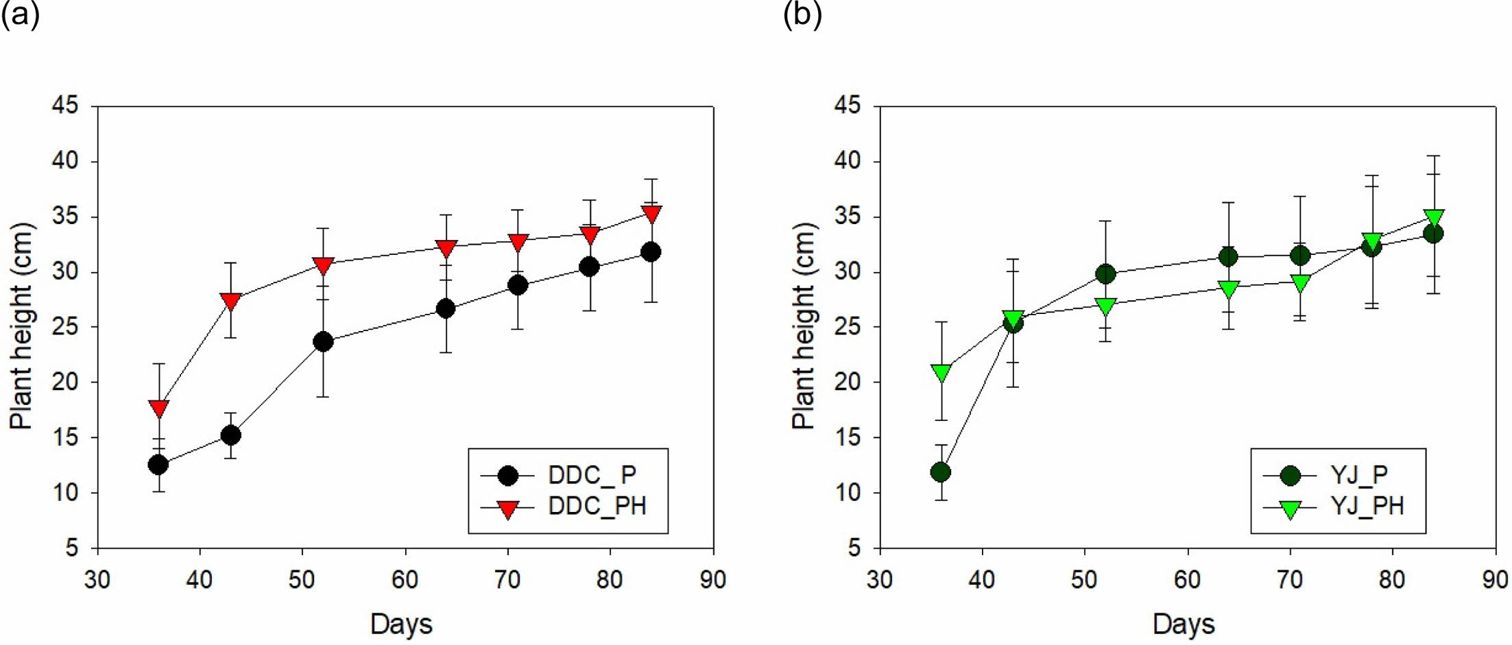 Fig. 1 The effects of humic substance (HS) treatment on longitudinal plant growth in the reclaimed soil. (a) growth in soil DDC; (b) growth in soil YJ. |