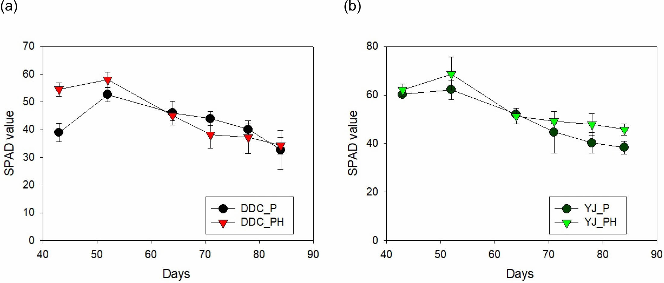 Fig. 4 Soil enzyme activities of the pot soil on day 89 post-sowing, which quantify PNP released from the substrate. (a) Soil DDC; (b) Soil YJ. |