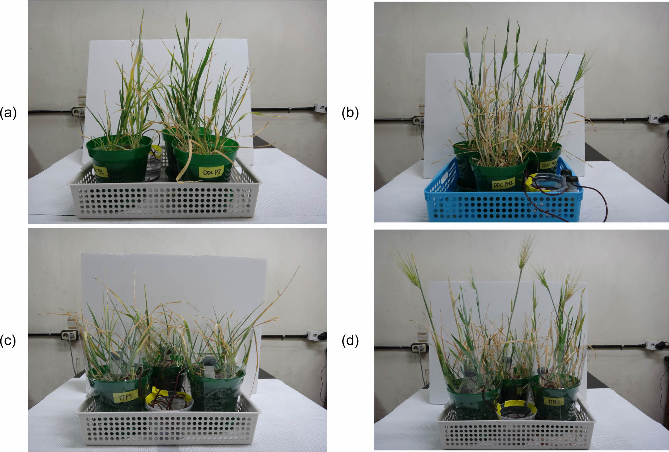 Fig. 3 The growth of green barley in the reclaimed soil. Pictures were taken on day 89 after sowing. (a) Plant only in soil DDC; (b) Plant+HS in soil DDC; (c) Plant only in soil YJ; (d) Plant+HS in soil YJ. |