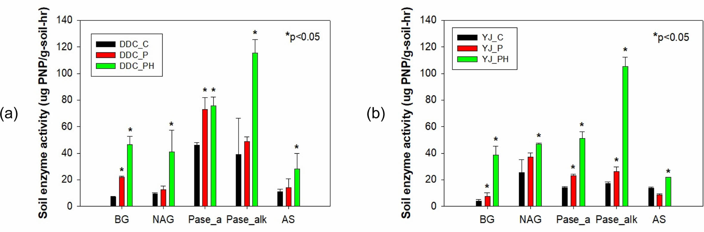 DDC토양 대조구에서의 BG, NAG, Pase_a, Pase_alk 및 AS의 활성(μgPNP/g-soil-hr)은 각각 7.3, 9.6, 46.2, 38.9 및 11.0이었고, 식물을 식재한 P처리구에서 각각 22.0, 12.6, 73.1, 48.7 및 14.2로 모두 증가하였으며, PH처리구에서는 각각 46.5, 41.1, 114.3, 115.2 및 28.2로 크게 증가하였다(Fig. 4a). NAG를 제외하고 YJ토양에서의 토양효소활성은 DDC토양에 비해 전반적으로 낮았다. 또한 BG 활성은 토양 pH에 비례하는 것으로 보고되었으나(Acosta-Martinez and Tabatabai, 2000), 토양 pH가 8.5로 높은 YJ토양에서의 BG는 DDC토양의 70%에 불과하였다. 이는 YJ토양이 열처리과정에서 미생물이 사멸한 것이 원인이라 판단된다.