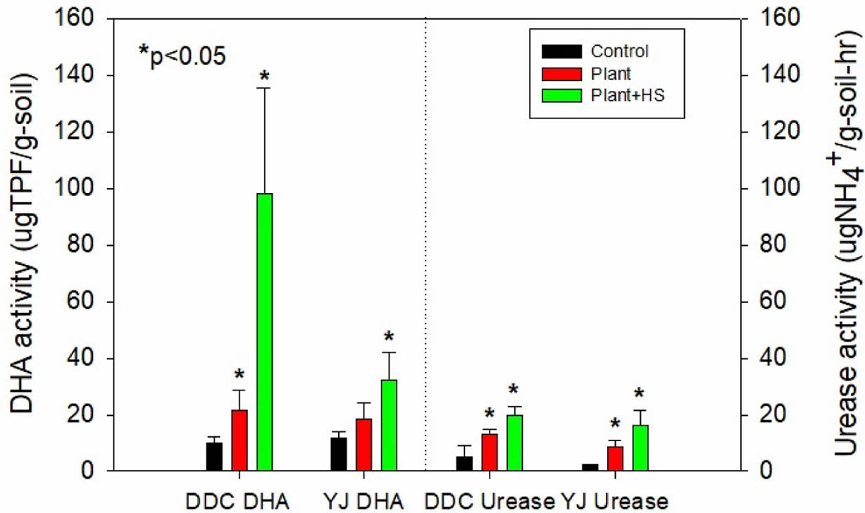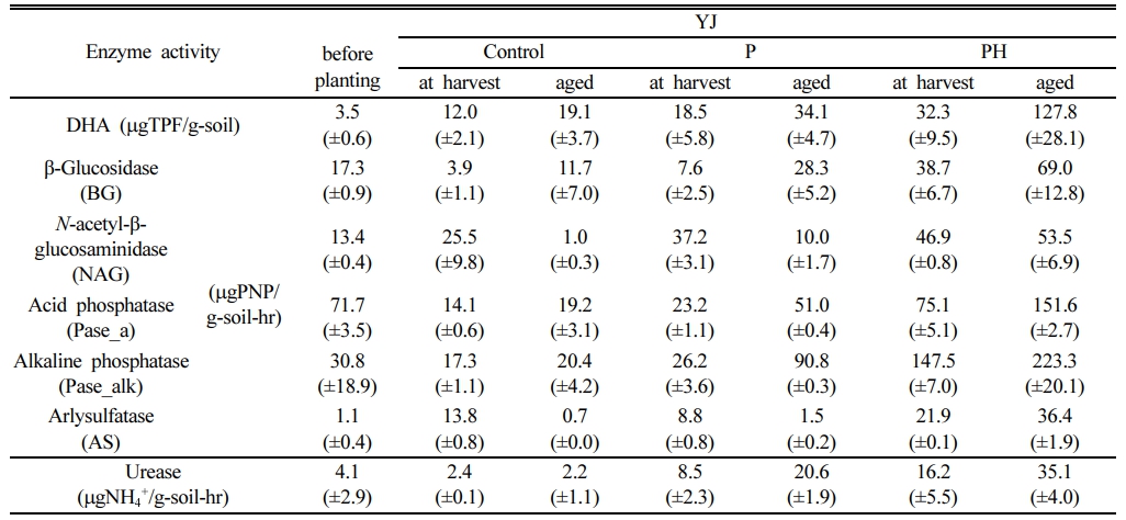 YJ토양 대조구에서의 BG, NAG, Pase_a, Pase_alk 및 AS의 활성(μgPNP/g-soil-hr)은 각각 3.9, 25.5, 14.1, 17.3 및 13.8이었는데, P처리구에서 각각 7.6, 37.2, 23.2, 26.2 및 8.8로 소폭 증가하는 경향을 보였고, PH처리구에서는 각각 38.7, 46.9, 75.1, 147.5 및 21.9로 유의하게 증가하였다(Fig. 4b). PH처리구의 DHA는 DDC토양 및 YJ토양에서 각각 98.0 및 32.3 μgTPF/g-soil로 대조군 대비 3~9배 이상 증가하였고, urease는 DDC토양 및 YJ토양에서 각각 20.0 및 16.2 μgNH4+/g-soil-hr로 대조군 대비 4배 이상 증가하였다(Fig. 5). 청보리와 HS를 첨가한 토양의 PH처리구에서는 모든 토양효소활성이 대조군에 비해 유의하게(p<0.05) 증가하였다. 그러나 식물만을 식재한 경우에는 일부 효소활성증가가 유의적이지 않았다.