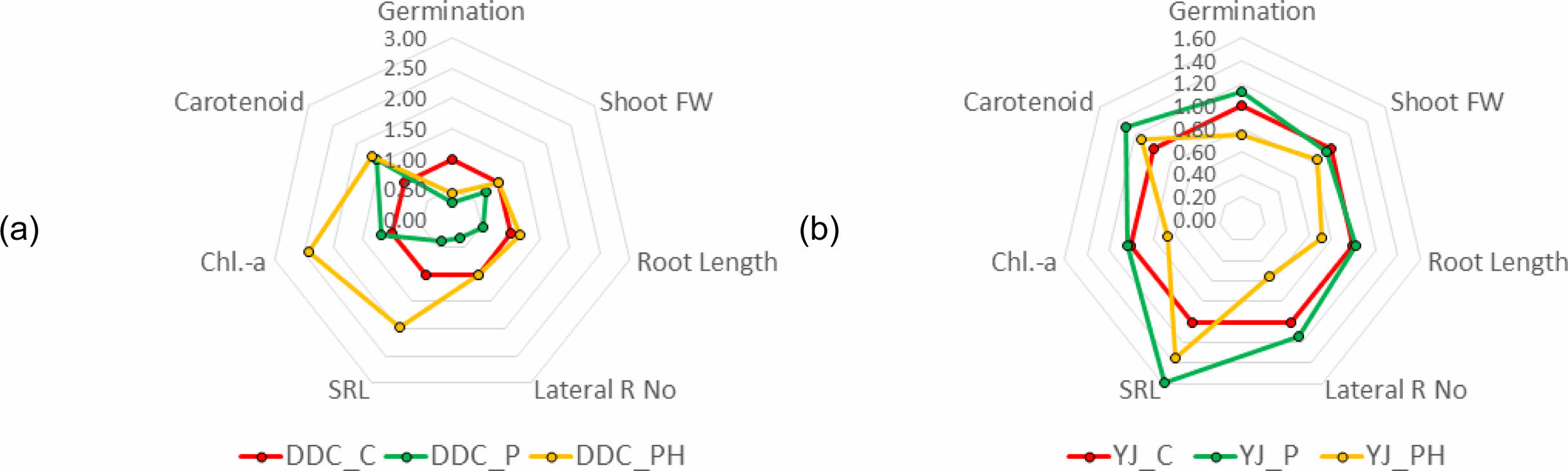 이상의 지표와 발아율, 지상부 생체량, Chl-a 및 carotenoid 함량을 대조구 토양에서의 렌틸 생장을 기준(1.0)으로 하여 비교한 결과는 Fig. 7과 같다. DDC 대조구 토양에서의 렌틸 발아율은 78%이었으나, 청보리 재배구(P 및 PH)에서는 각각 11~33%로 발아율이 매우 낮았다. 그 이외에는 DDC_PH 토양에 식재한 렌틸의 뿌리 길이, 측근의 수 및 SRL은 모두 1.0을 상회하였으며, 모든 값을 평균한 생장지표는 1.38로 대조군 대비 렌틸 생장이 활발하였다(Fig. 7a). YJ 대조구 토양에서의 발아율은 89%이었고, 이에 반해 P처리구는 발아율 100%로 뿌리생장도 활발하여, SRL이 대조구 대비 1.6배 높았다(Fig. 7b). 이 결과는 발아율이 낮기는 하지만, 발아가 되면 훨씬 건강한 유식물로 생장한다는 것을 의미한다. 반면 YJ토양의 PH 처리군에서의 렌틸 생장은 SRL과 carotenoid가 1.0을 상회할 뿐, 발아율, 지상부 생체량, 뿌리 길이 및 Chl-a 함량은 대조구 대비 0.6~0.8의 비율로 낮았다. 이에 생장지표 값으로 비교하면, YJ_P처릭구는 1.2이고, YJ_PH처리구는 0.86에 불과하여 YJ토양인 경우 HS를 투입하지 않은 토양에서의 식물생장이 우수한 것으로 나타났다.
