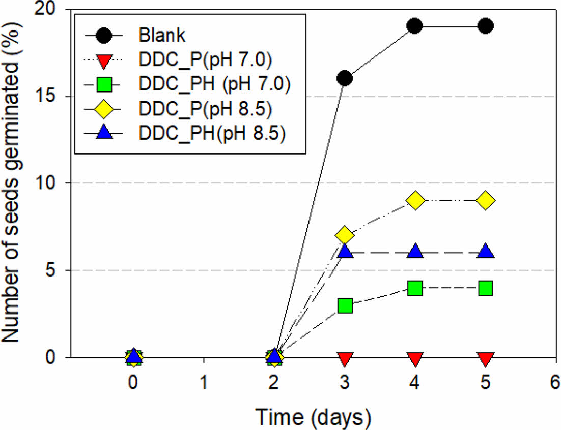 청보리에 의한 타감 작용(allelopathy)을 확인하기 위해 DDC 토양의 P 및 PH 처리구 숙성토양의 추출물에 렌틸 발아실험을 실시하였다. 토양 추출액은 40 mL amber vial에 에탄올: 토양의 비를 5:1 비율로 넣고 150 rpm에서 1시간 동안 진탕하고, 침전시켜 상징액을 준비하였다. 상징액을 이분할하여 하나는 그대로 사용하고, 나머지는 1 N NaOH 용액으로 pH를 8.5로 조절한 다음, 각각의 상징액에 렌틸 종자 30개를 한 시간 동안 담아두었다. 이 후 멸균된 여과지 및 DIW 5 mL을 넣은 페트리 디시에 렌틸 종자를 파종하고, 25oC에서 암배양하면서 5일간 발아율을 관측하였다. 이때 증류수에 침지한 대조군도 동시에 실험하였다.