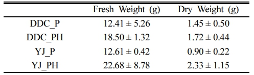 청보리 뿌리는 수염뿌리로 수확과정에서 2차 뿌리가 모두 부스러지고, 뿌리와 토양을 정확하게 분리할 수 없어 지상부 생체만 수확하였다. 각 실험구에서 최종 수확한 청보리 생체량 및 건량은 Table 1과 같다. DDC 토양에 식물 및 식물+HS 처리구에 식재한 청보리 건량은 각각 1.45 및 1.72 g으로, HS를 투입한 처리구에서 16% 높았다. YJ 처리구에서는 HS 투입구에서 2.33 g이었고, 청보리만 식재한 곳에서는 0.90 g에 불과하여, HS 투입으로 건량이 1.6배 증가하였다. 식물체 지상부 건량에 대해 T-test한 결과, 90% 수준에서 통계적으로 유의하였다(p< 0.10). 그러나 염분 스트레스가 있는 농토에 식재한 청보리의 지상부 수확량은 5(ton/ha)으로(Boussora et al., 2019), 20 cm 화분면적으로 환산하면 15.7 g-D.W./0.0314 m2이 수확되어야 하며, 본 연구의 건량의 약 10배 수준이다. 그러므로 현장 적용에서는 더 많은 생체량이 산출되어 토양으로 환원될 수 있으므로, 토양건강성을 회복할 수 있을 것으로 판단된다.