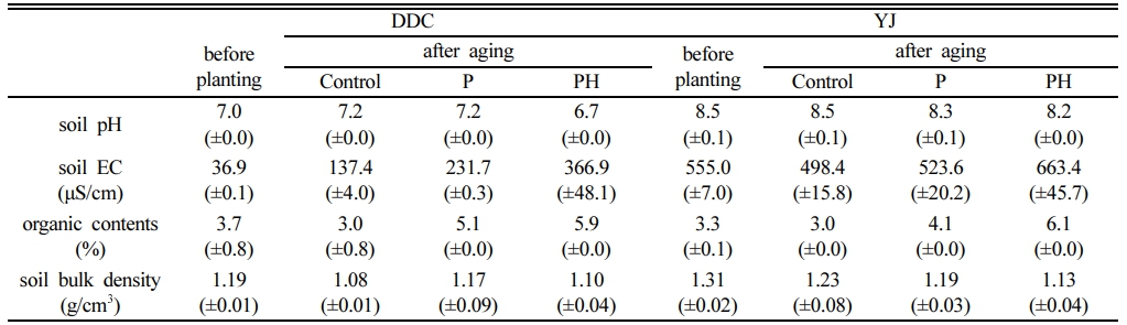 수확한 청보리를 토양환원하고 10주간 후숙한 다음, 토양의 물리화학적 변화를 측정한 결과는 Table 2와 같다. 유기물 함량은 식물체 뿌리와 지상부의 영향으로 증가하였는데, DDC 토양에서는 3.7에서 5.1~5.9%로, YJ토양에서는 3.3에서 4.1~6.1%로 증가하였다. 토양 pH는 식물체의 분해과정에서 발생하는 유기산에 의해 두 토양 모두 감소하였는데, PH처리구에서 더 많이 감소하였다. 동시에 분해 산물에 의한 효과로 EC가 증가하였고, PH처리구에서 더욱 현저하게 증가하였다. 용적밀도 역시 감소하는 추이를 보였다. DDC토양의 용적밀도는 초기 1.19 g/cm3이었으나 P 및 PH처리구에서 각각 1.17 및 1.10 g/cm3으로 감소하였고, YJ토양에서도 초기 1.31 g/cm3이었으나 P 및 PH처리구에서 각각 1.19 및 1.13 g/cm3으로 감소하였다. 자연토양에서 토양유기물 함량이 증가하면 거대공극이 발생함으로써 인간이 간섭한 토양보다 용적밀도가 낮은 경향을 보이며, 거대공극은 통기성 및 투수성을 증가시켜 입단성과 토양구조를 개선한다(Bini et al., 2013). 청보리 지상부는 건량으로 1~2 g에 불과하지만, 추수하지 못한 뿌리까지 포함하면 상당량의 유기물이 유입되어 유기물함량과 용적밀도가 증가한 것이라 사료된다.