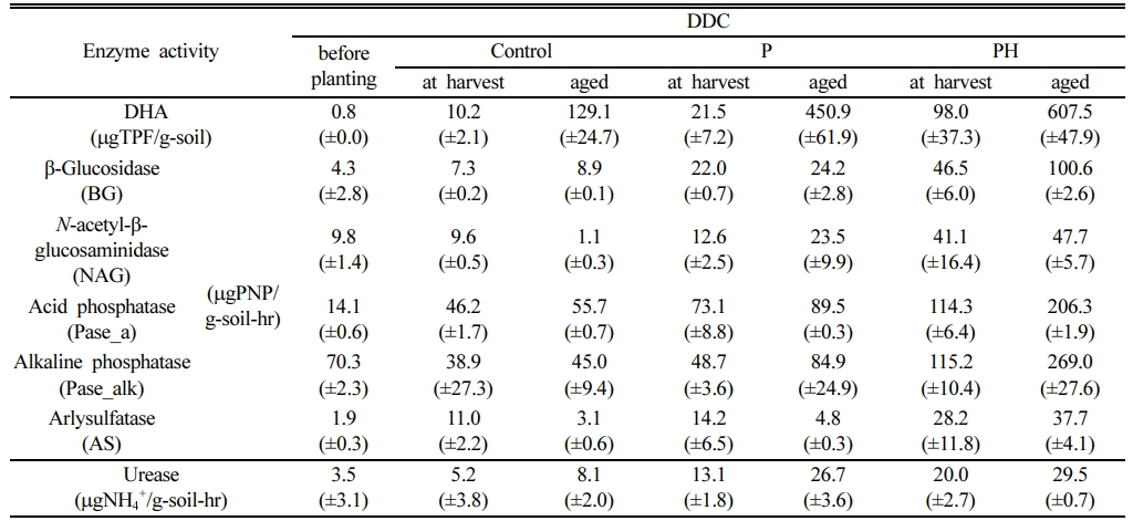 토양효소는 측정방법은 다음과 같다. DHA(dehydro- genase activity)는 습윤 토양을 Pepper and Gerba(2004)법으로 측정하고, 함수량으로 값을 보정하였다. 효소반응 산물인 PNP(para-nitrophenol) 농도를 측정하는 β-glu- cosidase(BG), N-acetyl-β-D-glucosaminidase(NAG), acid 및 alkaline phosphatase(Pase_a 및 Pase_alk) 및 Aryl- sulfatase(AS)는 Stott(2019)의 방법으로, 토양 Urease는 Kandeler and Gerber(1988)법을 사용하였는데, 모두 2배수로 측정하였다.