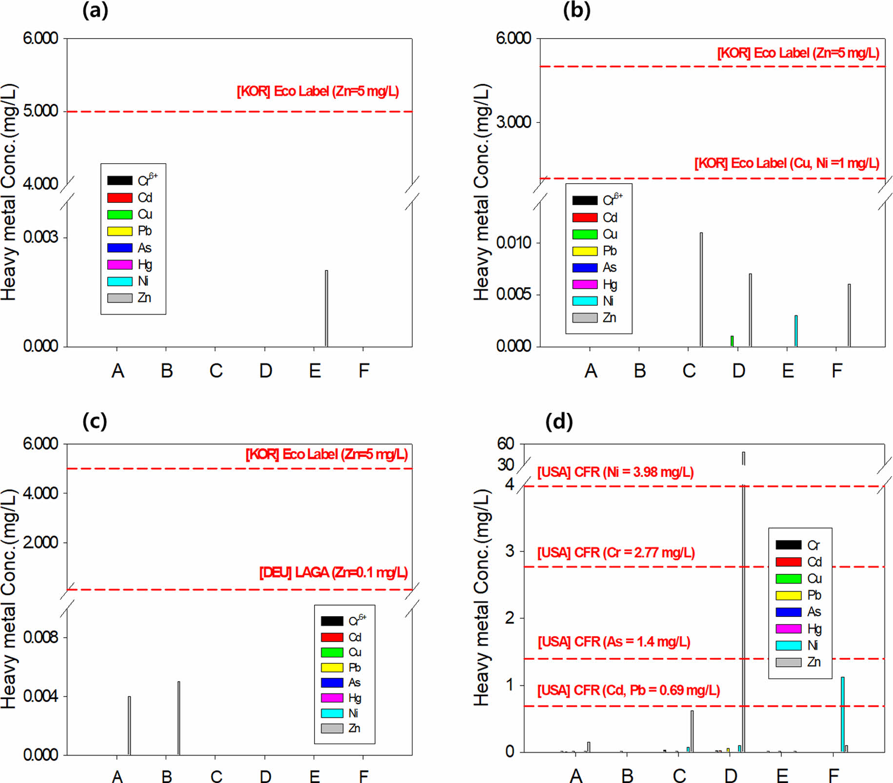국내 용출시험방법에 따른 제강슬래그 용출시료의 pH, 전기전도도, 용존산소, 산화환원전위는 Table 6과 같으며, 모든 제강슬래그 시료의 용출수 pH는 10.3~12.8로 높게 나타났다. 용출수의 중금속 농도 및 그에 따른 기준만족 여부는 Fig. 1(a)와 같다. 전로제강슬래그와 전기로일반슬래그는 중금속이 용출되지 않았으며, 전기로특수슬래그의 경우 Zn이 정량한계 미만(0.002 mg/L)~0.0021 mg/L로 확인되었다. 다만, 국내 폐기물 용출기준 및 환경표지인증기준(Table 2)을 모두 만족하는 것으로 나타났다.