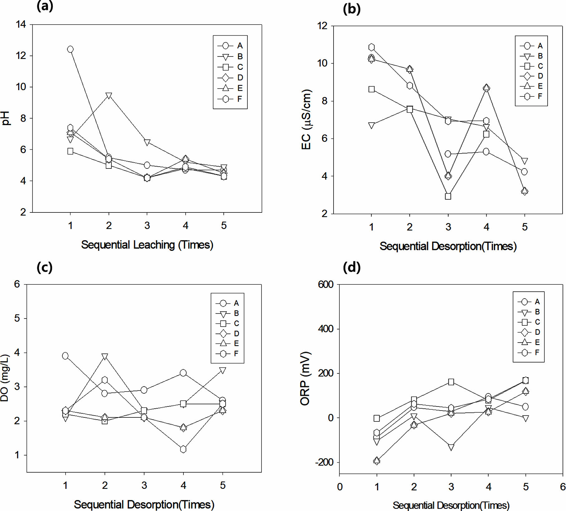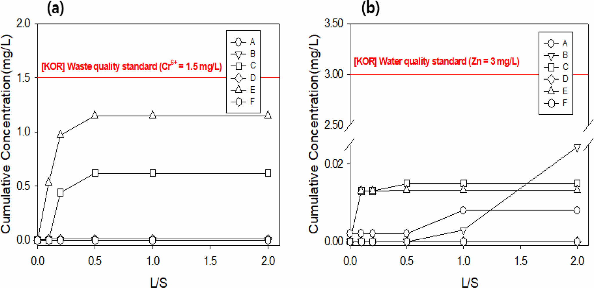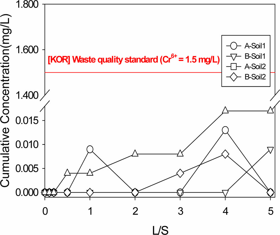 모든 시료에서 Cd, Cu, Pb, As, Hg, Ni, Zn은 모두 정량한계 미만으로 검출되었으나, Cr6+의 경우 정량한계 미만(0.002 mg/L)-0.009 mg/L로 검출되었다(Fig. 5). 자연토양 2를 적용하였을 경우, L/S 비가 1까지 유출되었을 때 토양의 pH와 유사하였으나, L/S 비 2부터 pH가 증가하는 경향을 보였다. L/S비 3부터 유출수는 모두 11.5 이상의 강알칼리성으로 나타났다(Fig. 4). 모든 시료에서 Cd, Cu, Pb, As, Hg, Ni, Zn은 모두 정량한계 미만으로 검출되었으나, Cr6+ 만이 정량한계 미만(0.002 mg/L)-0.009 mg/L으로 검출되었다(Fig. 5). 제강슬래그 단독 조건 및 2중층 조건 모두 유출수의 중금속 농도가 환경기준을 만족하였으나 누적 Cr6+, Zn의 농도가 증가하는 것으로 나타났다. 제강슬래그를 매체접촉형으로 재활용하는 경우 강우 등에 의해 중금속 및 고 pH 유출수가 지속적으로 용출되어 주변 환경으로 영향을 미칠 수 있으므로, 이를 방지하기 위한 재활용 방안이 마련되어야 한다.