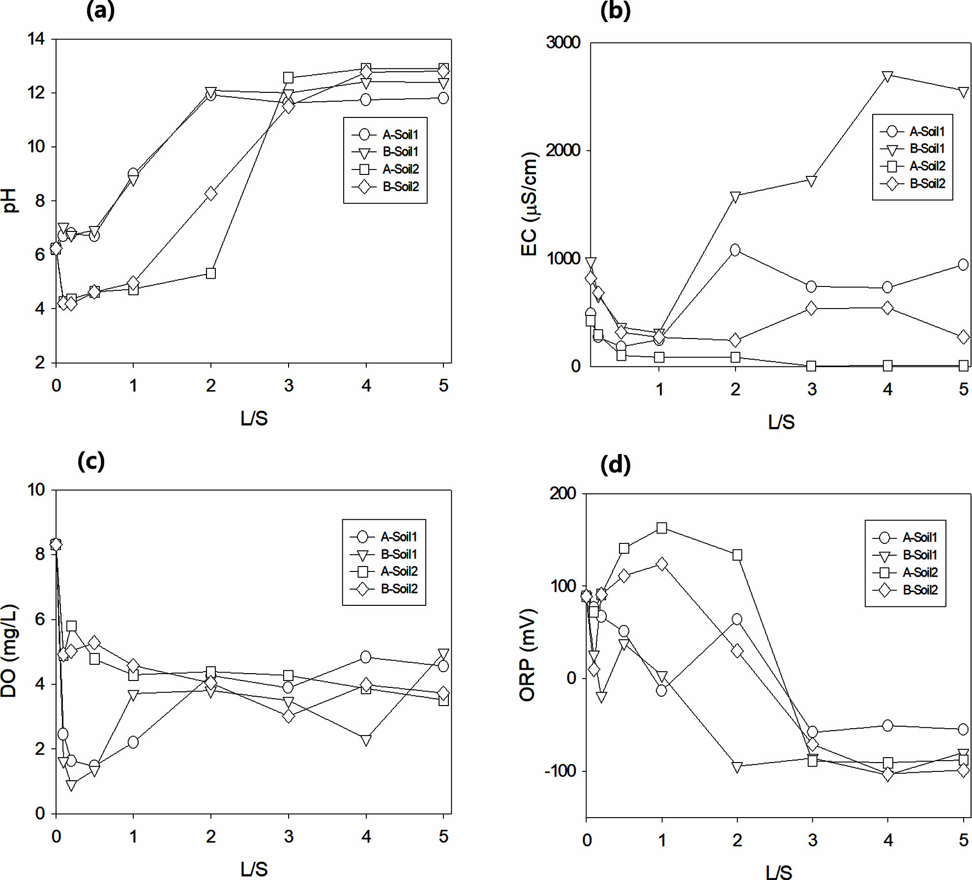 자연토양 1을 적용하였을 경우, L/S 비 0.5까지 유출시켰을 때 토양의 pH와 유사한 것으로 확인되었으나 L/S 비 1부터 유출수의 pH가 증가하여 L/S 비 2부터 전로제강슬래그 단독 조건에서의 유출특성과 비슷한 결과가 나타났다(Fig. 4). L/S 비 3부터 유출수는 모두 11.5 이상의 강알칼리성으로 나타났다. 실제 매체접촉형 재활용 현장에서 제강슬래그의 유출수 pH가 자연토양에 의해 저감될 수 있으나, 용출이 지속되는 경우 고 pH 유출수가 발생할 가능성이 있다.