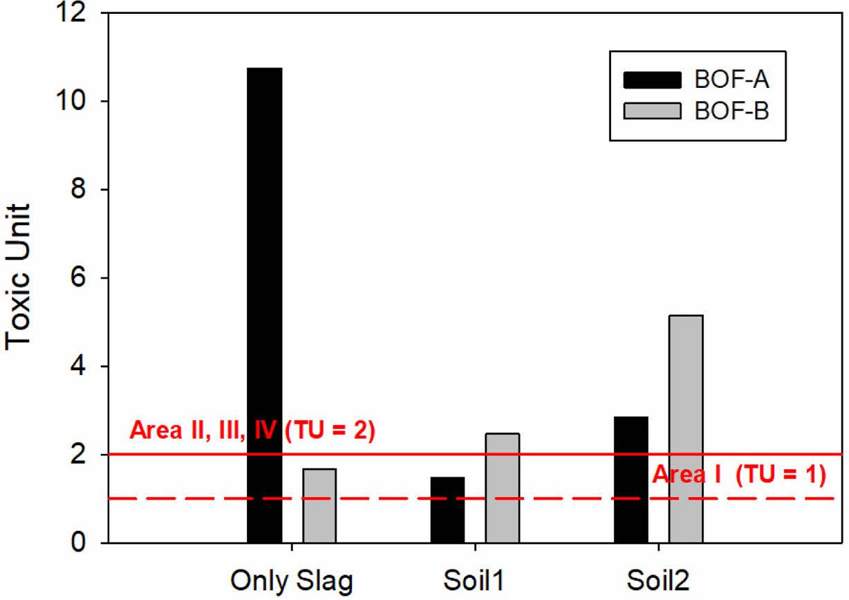 제강슬래그 및 제강슬래그/자연토양 2중층 조건에서의 상향류 투수방식 유출시험에 따른 유출수 시료를 이용하여 24시간 물벼룩 생태독성 시험을 실시한 결과, 원시료에 대해 대부분 생태독성 기준(TU=2)을 만족하지 못하는 것으로 나타났다. pH를 6.5~8.5로 중화한 시료의 경우 물벼룩의 치사 및 유영저해가 발견되지 않았으며 생태독성 기준(TU=2) 또한 모두 만족하는 것으로 나타났다.