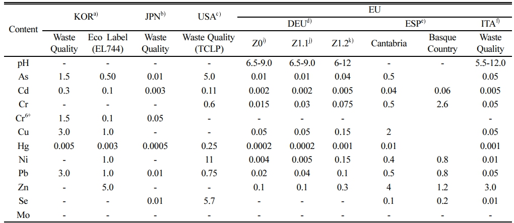 국내에서 발생하고 있는 제강슬래그는 대부분 성·복토재, 도로용 기층재 등 매체접촉형 골재로 활용되고 있으며(KISA, 2022), 국외 또한 매체접촉형 골재뿐만 아니라 벽돌, 시멘트 등 건설용 골재로 활용되고 있다(Gencel et al., 2021). 국내외 제강슬래그를 재활용하고자 하는 경우 먼저 용도에 따라 용출시험을 통한 환경기준을 만족해야 한다(Tables 1-2). 국내의 경우 폐기물관리법에 따른 용출기준을 우선적으로 만족해야 하며, 매체접촉형으로 재활용하고자 하는 제강슬래그의 양이 12 만톤 이상 또는 재활용 대상 부지 면적이 3만 제곱미터 이상인 경우 재활용환경성평가 대상으로 구분되어 상향류 투수방식 유출시험을 수행하여야 한다(KMOE, 2020). 다만, 환경표지인증기준을 받는 경우 재활용환경성평가를 면제받을 수 있다(KMOE, 2023). 환경표지인증에서 제시하고 있는 환경기준은 폐기물관리법의 1/3 수준의 기준을 적용하고 있으나, 최근 국내에서 제강슬래그의 매체접촉형 재활용에 따른 고 pH 침출수 유출 또는 중금속 용출 등의 우려가 계속됨에 따라 토양·수질 등과 접촉하여 재활용되는 상황을 고려하여 해당 기준의 타당성에 대한 검토가 필요하다(Hong, 2021).