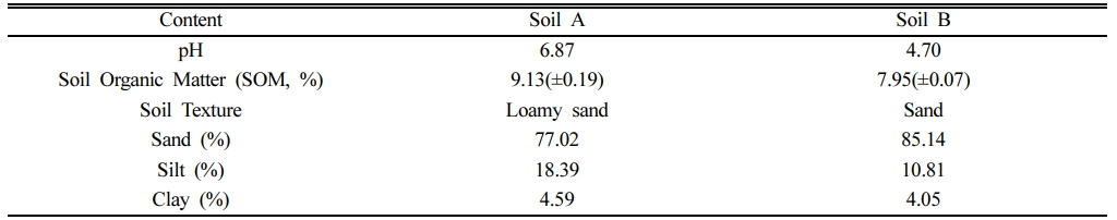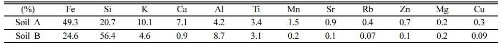 주변 환경으로의 영향 여부를 간접적으로 확인하기 위해 전로제강슬래그를 대상 시료로 선정하여 슬래그/토양 조건에서의 상향류 투수방식 유출시험을 수행하였다. 두 종류의 자연토양을 사용하였으며, 각각 경상북도 안동시 야산(Soil A, 36°29'20.7"N 128°48'51.7"E), 경상남도 창녕군 야산(Soil B, 35°34’38.69”N, 128°28’30.86”E)에서 시료를 채취하였다. 기본특성 및 XRF(X-ray Fluores- cence spectroscopy) 분석결과는 각각 Table 4와 Table 5에 나타내었다. 유리관 내부는 매체접촉형 재활용 현장을 모사하기 위해 제강슬래그와 자연토양을 높이 비 1:1로 충전하였으며, 초순수를 용리액으로 사용하여 제강슬래그 층을 포화시켰다. 포화 이후 충전된 제강슬래그 시료 무게를 기준으로 L/S 비가 5가 될 때까지 유출시켰으며, 제강슬래그 시료를 기준으로 L/S 비가 0.1, 0.2, 0.5, 1, 2, 3, 4, 5일 때 유출수 시료를 채취하여 시간에 따른 유출수의 특성을 비교하였다.
