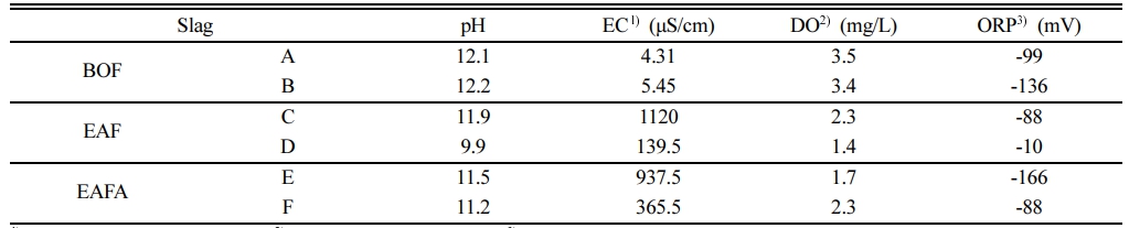 일본의 용출시험방법에 따른 제강슬래그 용출시료의 pH, 전기전도도, 용존산소, 산화환원전위는 Table 7과 같으며, 용출시험 결과 모든 시료의 pH는 9.9~12.2으로 높게 나타났다. 전로제강슬래그의 경우 용출되는 중금속은 없는 것으로 나타났으나 전기로일반슬래그의 경우 Cu는 정량한계 미만 (0.001 mg/L)-0.001 mg/L, Zn은 0.007-0.011 mg/L로 용출되었으며, 전기로특수슬래그의 경우 Ni은 정량한계 미만(0.003 mg/L)-0.003 mg/L, Zn은 정량한계 미만(0.002 mg/L)-0.006 mg/L로 용출되었다(Fig. 1(b)). Cu, Ni, Zn의 경우 일본의 폐기물 용출기준 항목에 포함되지 않으며, 국내 환경표지인증기준을 적용했을 때 모두 만족하는 것으로 나타났다(Table 2).