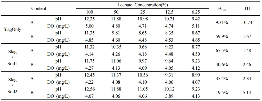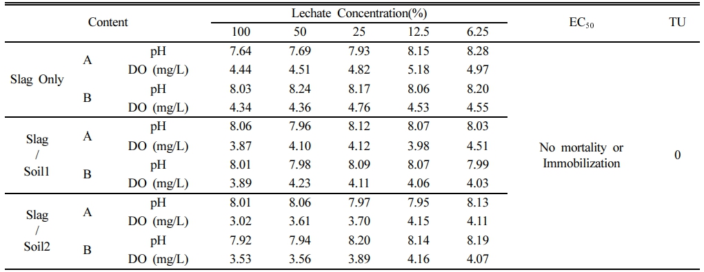 제강슬래그 단독 및 제강슬래그/자연토양 조건에서 상향류 투수방식 유출시험을 통해 채취한 유출액 시료(L/S = 2)를 사용하였으며, 유출수 원수 100%를 기준으로 50, 25, 12.5, 6.25%로 희석하여 농도에 따른 독성평가를 수행하였다. 이때, 희석수는 배양액과 동일한 것을 사용하였다. 농도 당 시험용액의 양은 50 mL로 하였으며, 물벼룩을 5마리씩 4개의 반복구를 두었다. 시험시간 동안 시험 온도는 20 ± 2oC 범위로 유지하며, 조명은 명:암 = 16:8시간을 유지하고 물 교환, 먹이공급, 폭기는 하지 않았다. 24시간 후의 물벼룩의 유영저해 및 치사여부를 확인하고 50%가 치사 혹은 유영저해를 나타내는 농도인 반수영향농도(EC50)를 평가하였으며, 이를 바탕으로 수질오염공정시험기준 ES 064704.1b에 따라 100/EC50을 적용하여 생태독성값(TU)을 산출하였다.