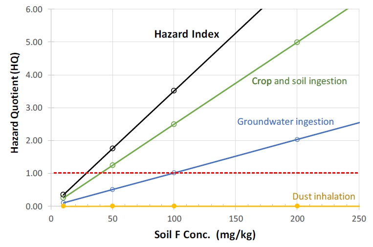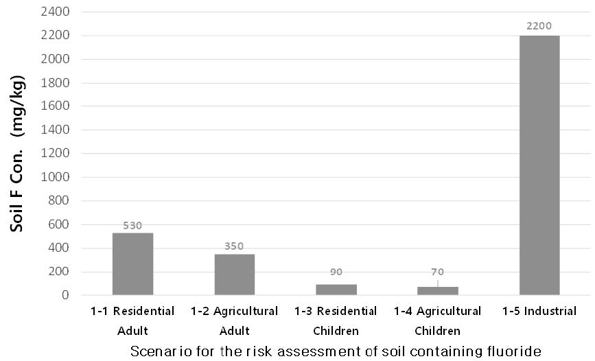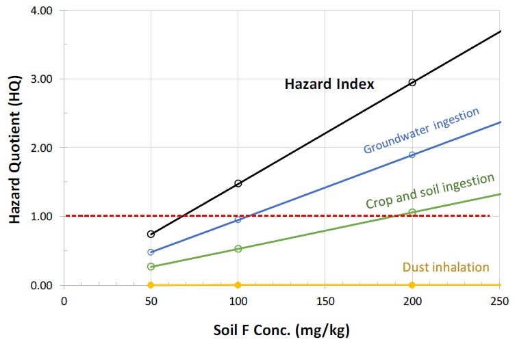 Table 1에 제시된 10개 시나리오와 토양 내 불소 농도 50 mg/kg~4000 mg/kg 범위 내 토양 섭취, 농작물 섭취, 지하수 섭취, 비산먼지 흡입 등 각 노출경로에 위험비율(Hazard Quotient, HQ)과 위험지수(Hazard Index, HI)를 산정하였고, HI=1.0에 해당하는 불소 토양 농도를 결정하였다.