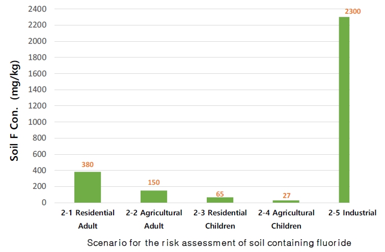 본 연구는 10개 시나리오의 HI=1.0에 해당하는 위해도 기반 10개 불소 토양농도 중 최종 제시한 ‘위해도 기반 불소 토양 기준치’는 어린이를 기준 한 시나리오의 불소 농도였다.