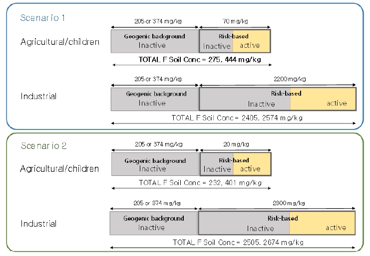 본 연구는 Fig. 5와 같이 Added risk approach에 의한 총 불소 토양 기준안을 제시하였다. 우리나라 불소 배경농도는 Lim et al.(2018)이 제시한 불소 토양 평균치 204.5 mg/kg와 95백분위수에 해당하는 374.2 mg/kg을 활용하였다. 따라서 Added risk approach에 의한 총 불소 토양 기준치(Total F soil quality guideline)는 시나리오 1에서 농업지역 어린이 275 mg/kg~444 mg/kg, 산업지역 2405~2574 mg/kg, 시나리오 2에서 농업지역 어린이 232 mg/kg~401 mg/kg, 산업지역 2505~2674 mg/kg로 산정되었다.