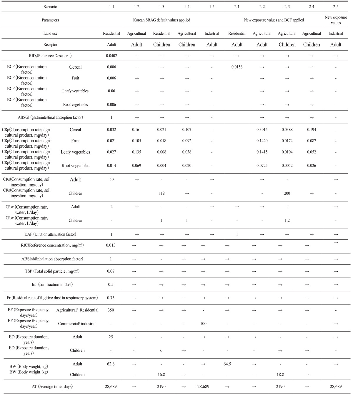 Table 1에서 시나리오 1-1부터 1-5까지 위해성 평가는 현재 ‘지침’에 제시된 독성평가 및 노출평가 기본(Default) 인자값을 적용하였다(MOE, 2018). 단, 시나리오 1-5(산업/상업용지)는 농작물 섭취 경로를 고려하지 않고 토양 섭취, 지하수 섭취, 비산먼지 흡입 등 3개 경로만 고려하였다. 시나리오 1은 현재 지침에 제시하고 있는 2007년 한국 노출계수 핸드북의 기본 인체 노출계수(체중, 음용수량, 토양섭취량) 및 농작물 평균 섭취량을 그대로 사용하였다.