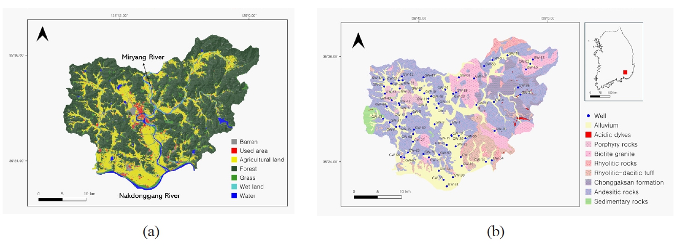 연구지역인 경상남도 밀양시는 전체 면적이 798.98 km2이며, 지리적으로는 동경 128°34'23" ~129°01'41", 북위 35°20'30" ~35°38'07"에 위치한다. 밀양시의 행정구역은 16개 읍면동으로 삼랑진읍, 하남읍, 부북면, 상동면, 산외면, 산내면, 단장면, 상남면, 초동면, 무안면, 청도면, 내이동, 교동, 내일동, 삼문동, 가곡동이 있다. 토지피복도는 중분류 토지피복 자료(EGIS, 2024)와 1:25,000 수치지형도 자료(NGII, 2024)를 이용하였으며, 7개의 항목(시가화·건조지역, 농업지역, 산림, 초지, 습지, 나지, 수역)으로 구분하였다. 밀양시는 지형적으로 해발고도가 높고 경사도 18% 이상인 지역이 67%로 경사가 가파른 편이며 구릉성 산지가 넓게 분포하고 있다. 수계는 밀양시 중심을 관통하여 흐르는 밀양강과 남단의 낙동강이 가장 크며, 농업지역은 주로 낙동강과 밀양강을 따라 많이 분포되어 있다. 연구지역 내 토지이용 면적은 임야가 61.8%로 가장 큰 비율을 차지하고 있으며, 농경지 21.3%, 도심지는 3.1%를 차지한다. 주요 지질로는 중생대 백악기에 속하는 퇴적암류, 유천층군의 화산암류와 이들을 관입하고 있는 불국사 관입암체로 구성되며 신생대 제4기의 충적층이 부정합을 이루고 있다(Fig. 1). 퇴적암류는 주로 셰일 및 사암으로 구성되어 있으며 연구지역 서쪽에 광범위하게 관입 또는 분출된 안산암에 의해 피복되어 있다. 유천층군의 화산암류는 주사산 안산암류와 운문사 유문암질암류로 구분할 수 있고(Kim and Hwang, 1988), 이 주사산 안산암류는 다시 응회암류, 안산암류, 화산쇄설성 퇴적암으로 분류되며 연구지역 전체에 매우 넓게 분포하고 있다. 운문산 유문암질암류는 유문-안산암질 응회암 및 유문암질암으로 구분할 수 있으며, 유문암질암은 비교적 험준한 지역에 분포하고 있다(MLIT et al., 2003). 불국사 관입암체인 화강암류는 화학적인 특징에 따라 화강섬록암 및 흑운모화강암 등으로 구분할 수 있으며 반암류가 소규모 암주상 형태로 안산암류, 화강섬록암, 화강암을 관입하고 있다.