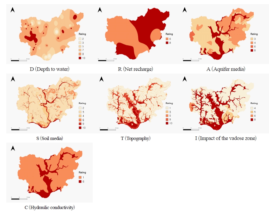 DRASTIC 인자의 결과를 QGIS v3.4.4를 이용하여 작성하였으며 Fig. 2에 정리하였다. 지하수 심도의 범위는 0.72~24.1 m이며 4.6~9.1 m을 나타내는 7등급의 비율이 44%로 가장 크게 나타났고, 지하수 함양량의 범위는 165.5~221.6 mm으로 6~8등급으로 분석되었다. 대수층 매질은 변성/화성암류, 퇴적암류 및 모래와 자갈로 구분할 수 있으며 본 연구에서는 변성/화성암류가 81%로 가장 큰 비율을 차지한다. 모래와 자갈로 구성된 충적층 지역은 상대적으로 투수성이 높기 때문에 등급이 높게 나타나는데, 밀양시는 토양 매질은 식양토가 76%로 가장 큰 비율을 차지하였으며 밀양강 및 낙동강과 인접하는 지역은 오염취약성이 높은 모래와 자갈로 구성된다. 지형 경사는 18% 이상인 지역이 67%로 가장 큰 비율을 차지하였지만, 충적층 지역은 비교적 완만하여 등급이 높게 나타났다. 불포화대 매질의 영향은 투수성에 따라 모래와 자갈, 사암과 셰일, 응회암류, 화성암류로 구분하였다. 화성암류의 비율이 64%로 가장 크게 나타났으며 모래와 자갈로 구성된 충적층 지역은 상대적으로 투수성이 높기 때문에 등급이 높게 나타났다.