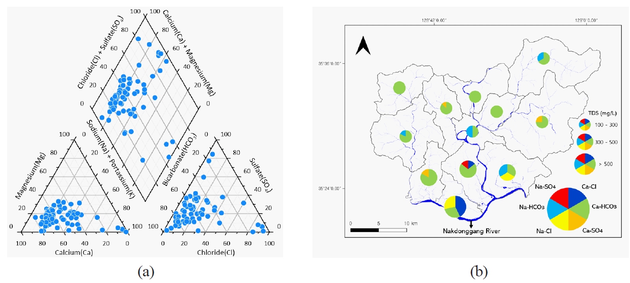 양·음이온 분석 결과를 Piper diagram에 도시하여 수질 유형을 파악한 결과(Fig. 3), 연구지역의 수질유형은 [Ca-Cl], [Ca-HCO3], [Ca-SO4], [Na-Cl], [Na-HCO3], [Na-SO4]으로 총 6가지의 유형이 나타났다. [Ca-HCO3] 유형은 72.9%로 가장 많은 비율을 차지하였으며, [Na-HCO3] 10.0%, [Ca-Cl] 5.7%, [Na-Cl] 5.7%, [Ca-SO4] 4.3% 및 [Na-SO4] 1.4% 순으로 나타났다. [Ca-HCO3] 유형의 천부 지하수는 일반적으로 오염되지 않은 지하수의 유형임을 나타내며, [Ca-HCO3] 유형의 지하수의 유동거리가 길어짐에 따라 지질매체와 반응하여 [Na-HCO3] 유형으로 바뀔 수 있다(Kim et al., 2017). 또한 농업활동이나 생활하수 등의 인위적인 오염원의 영향을 받게 되면 [Ca-Cl], [Na-Cl], [Ca-SO4] 및 [Na-SO4]의 유형이 나타날 수 있다(Kim et al., 2024). 연구지역의 읍면별 수질 유형을 공간적으로 파악하기 위해 Pie chart를 이용하여 지하수 수질유형 비율을 도시화한 결과(Fig. 3), 낙동강과 인접할수록 TDS가 높아지는 경향을 보였으며, 낙동강과 인접한 GW-30, GW-31, GW-33, GW-34의 TDS는 각각 6,071, 1,777, 1,607, 3,330 mg/L로 연구지역 평균값 433 mg/L보다 상대적으로 높은 것을 알 수 있다. 또한 낙동강과 인접할수록 오염을 나타내는 수질 유형의 비율이 높아지는 경향을 보이기 때문에 연구지역 하류는 자연적 기원보다는 인위적인 오염의 영향을 받은 것으로 판단된다.