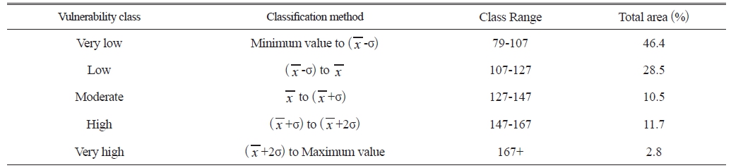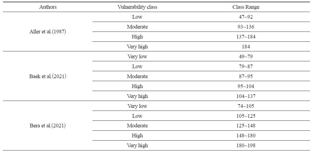 여기서 Dw, Rw, Aw, Sw, Tw, Iw, Cw는 각 인자의 가중치, DR, RR, AR, SR, TR, IR, CR은 각 인자의 등급을 의미한다. DRASTIC 지수는 일반적으로 70에서 200 사이의 값으로 결정된다(Patel et al., 2022). Aller et al. (1987)에 의해 제시된 DRASTIC 지수의 등급은 47~92가 Low, 93~136이 Moderate, 137~184가 High, 184 초과를 Very high로 구분한다. 그리고 Baek et al. (2021)에 의해서는 49~79가 Very low, 79~87이 Low, 87~95가 Moderate, 95~104가 High, 104~137을 Very high로 구분하며, Bera et al. (2021)에 의해서는 74~105가 Very low, 105~125가 Low, 125~148이 Moderate, 148~180이 High, 180~198을 Very high로 구분하는 등 DRASTIC 지수의 등급은 연구지역에 대한 상대적인 값이므로 평가자들이 어떻게 구분하는지에 따라 약간씩 차이가 발생된다(Table 1). 이번 연구에서는 연구지역 전체 면적에 대한 DRASTIC 지수의 평균을 Moderate로 가정하고 표준편차를 더하거나 뺀 값으로 등급을 나누어 상대적인 취약성 등급을 고려하였다. 이 방법은 DRASTIC 결과의 공간적 특성을 고려하여 평균값보다 높은 등급은 위험성이 높고, 낮은 등급은 위험성이 낮다는 것을 쉽게 구분할 수 있다. 이러한 접근법은 Taghavi et al. (2023)의 결과를 이용하였다.